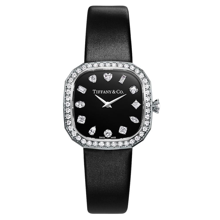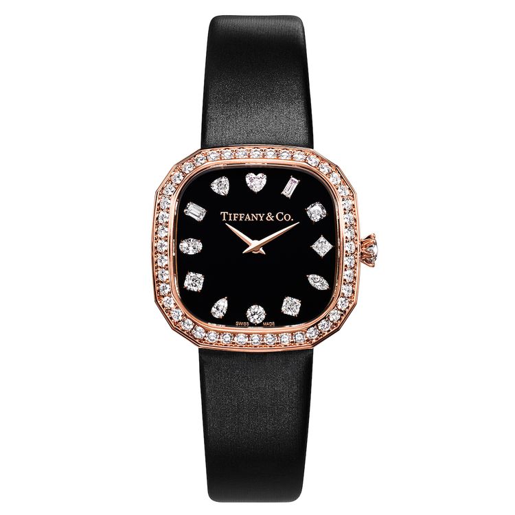 同商品はダイヤモンドにフォーカスする点が特徴で、インデックスにはハート型など12の異なるシェイプを用いる。さらに、それを取り巻くようにダイヤモンドをセット。りゅうずのダイヤモンドは、「ティファニー」を象徴する6本爪のエンゲージメントリング“ティファニー セッティング”に着想したものだ。