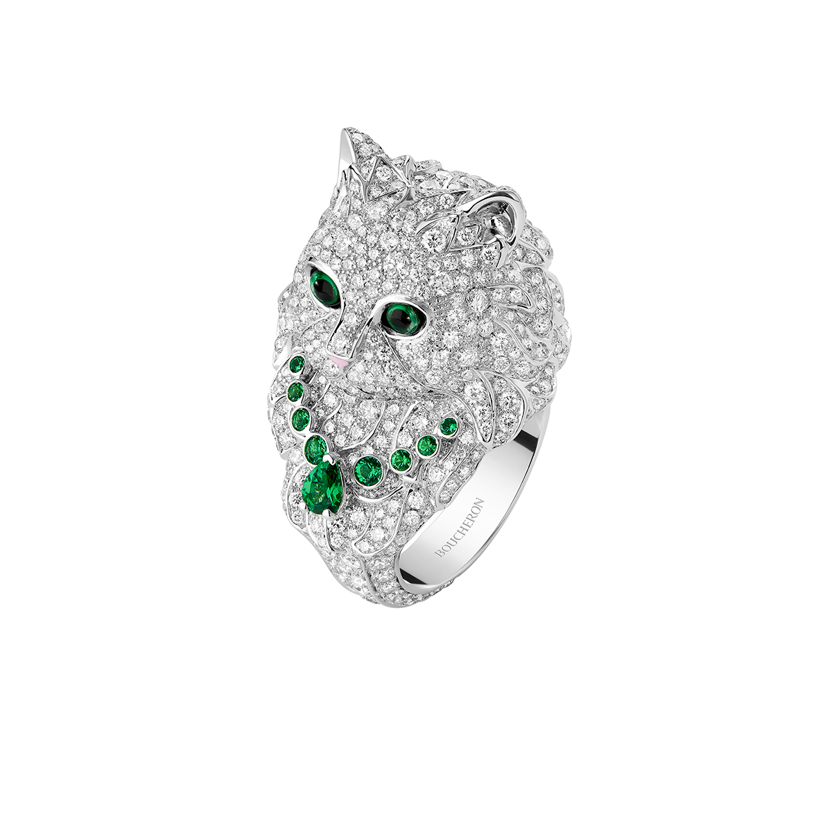 フランス発ジュエラー「ブシュロン」にとって、猫は欠かせない存在だ。3代目当主、ジェラール・ブシュロンの愛猫だったウラジミールは、ブランドのミューズやビジュアルモデルとして大活躍。オープンしたばかりの銀座本店の階段にもウラジミールの姿が映し出されている。その気品ある姿のジュエリーもあり、アニマルコレクションの中で人気モチーフになっている。