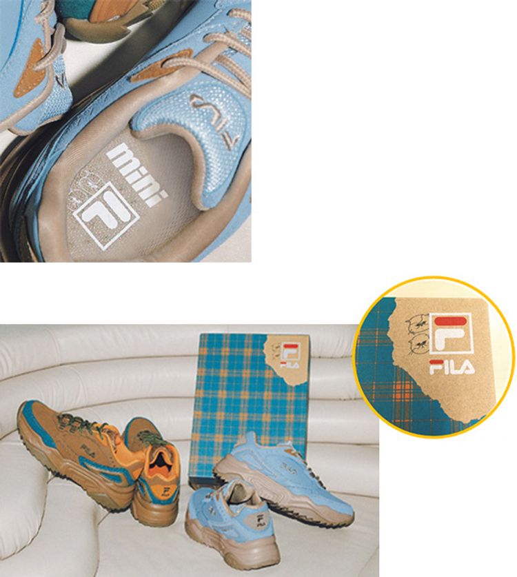 「フィラ」の人気モデル“ALTO2”をベースとしており、ブラウンとブルーのカラーリングはセントチヒロ・チッチがこだわったものだという。セントチヒロ・チッチは、「ブラウンは差し色のターコイズ、オレンジの色出しについて、『フィラ』に相談して何回もサンプルを作ってギリギリまで試行錯誤した。ブルーは“よし、今日は水色の靴を履くぞ!”と身構えなくていい、絶妙な淡さがポイント」と話す。
