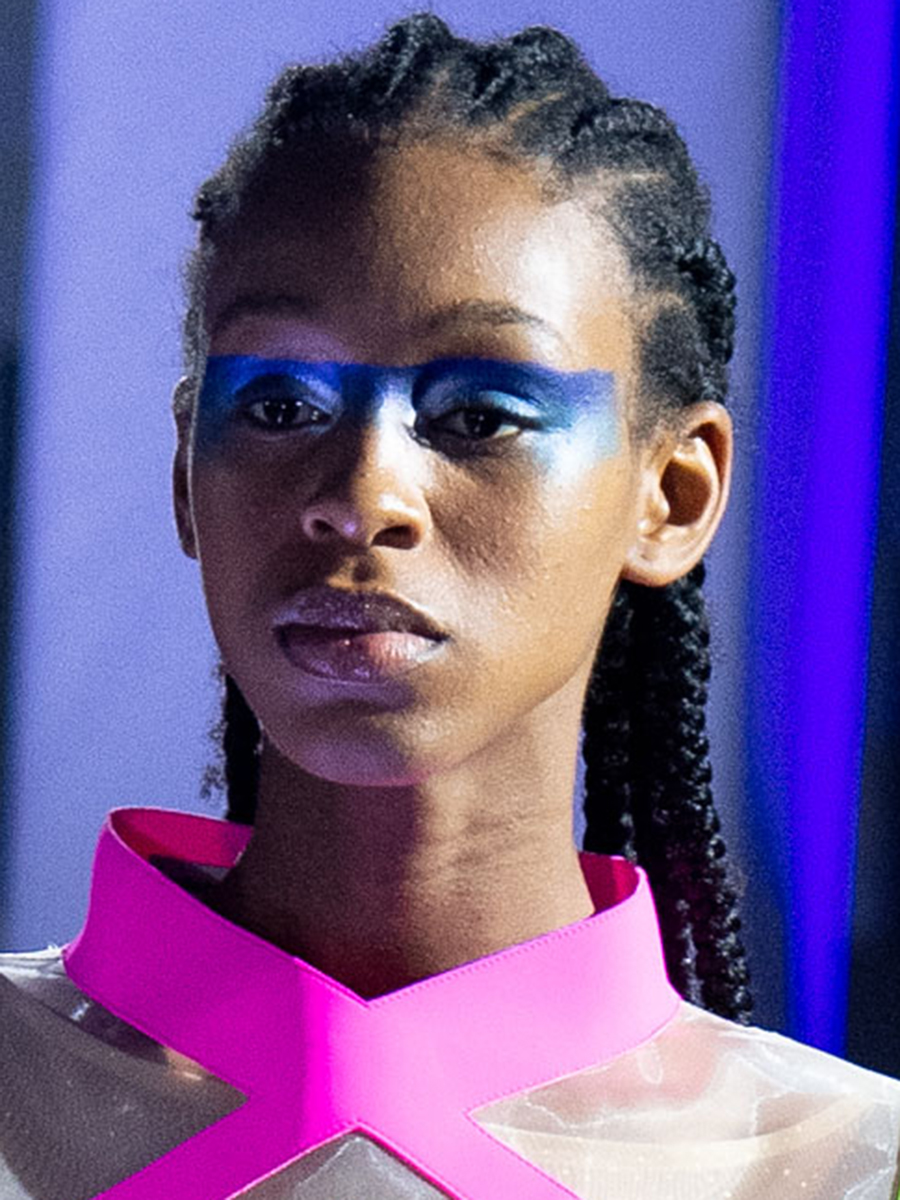 「ドリス ヴァン ノッテン(DRIES VAN NOTEN)」には目の外側に羽根のアイライナーを貼り付けたモデルが登場した。メイクアップ・アーティストのルーシー・ブリッジ(Lucy Bridge)は、洋服の色調に合わせてさまざまな色の羽根を使用し、自然かつインパクトのあるディテールを作った。こめかみからこめかみまでを青い波のように彩った「ピエール カルダン(PIERRE CARDIN)」のアイメイクも目を引いた。メイクチームはこのアイデアを「地平線と海面の統合」と言い、スポンジとブラシを使って青のグラデーションを実現した。目元は大胆に、唇はグロスをのせる程度に。グラフィカルなアイメイクを施したブランドは、口元の色味を抑え、バランスをとる傾向が見られた。