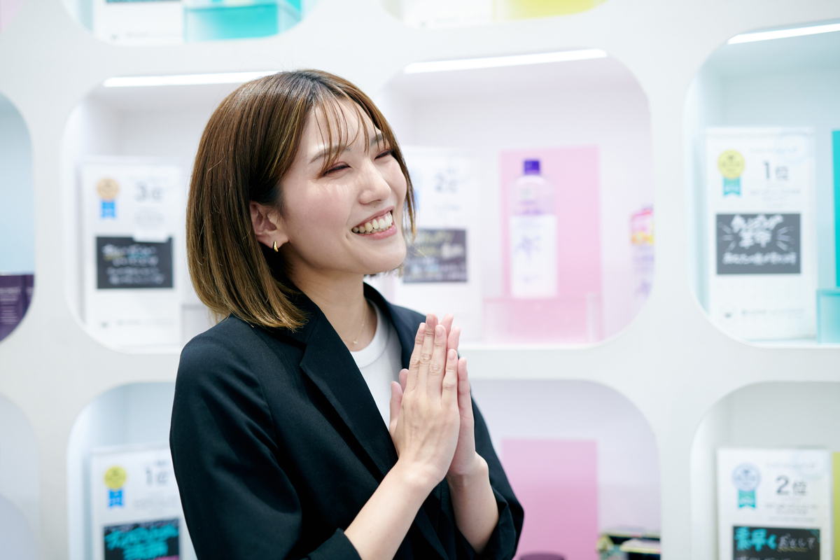 接客は、アットコスメの理念である「いつでもどこでも全ての生活者の味方に」を念頭に置きながらコミュニケーションすることを心がけている。「これだけの品数があるとお客さまも迷ってしまいがち。だからこそ会話の中からお客さまの悩みをいち早く引き出し、最適な解決法を一緒に探しながら、新たな商品との出合いを提供できるように意識しています」。