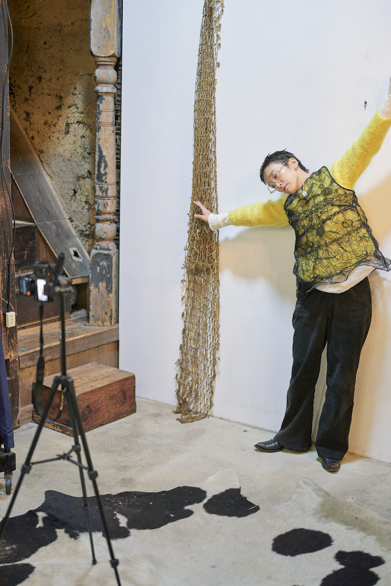 「スタイリングでは、異なる素材やフォームの組み合わせによって、引っかかりを生む“違和感”を作りたい。写真は一人でタイマーをセットして、カメラの前で動いて何枚も撮っている。その中で面白い表情やポージングを偶然捉えたものを使う」。聞くと、接客が苦手で、発信をインスタグラムに頼っているところがあるという。
