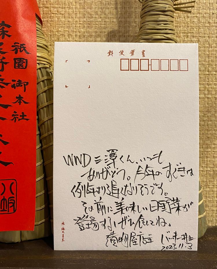京都府外に住む友人・知人や、僕は漬物屋や“床”(飲食店が鴨川に迫り出すように作る高床のテラス、京都の夏の風物詩)を営んでいるんで、お客さんに季節のあいさつをする際に使っています。封書だとちょっとヘビーだけど、絵葉書だとカジュアルに送れるでしょ?