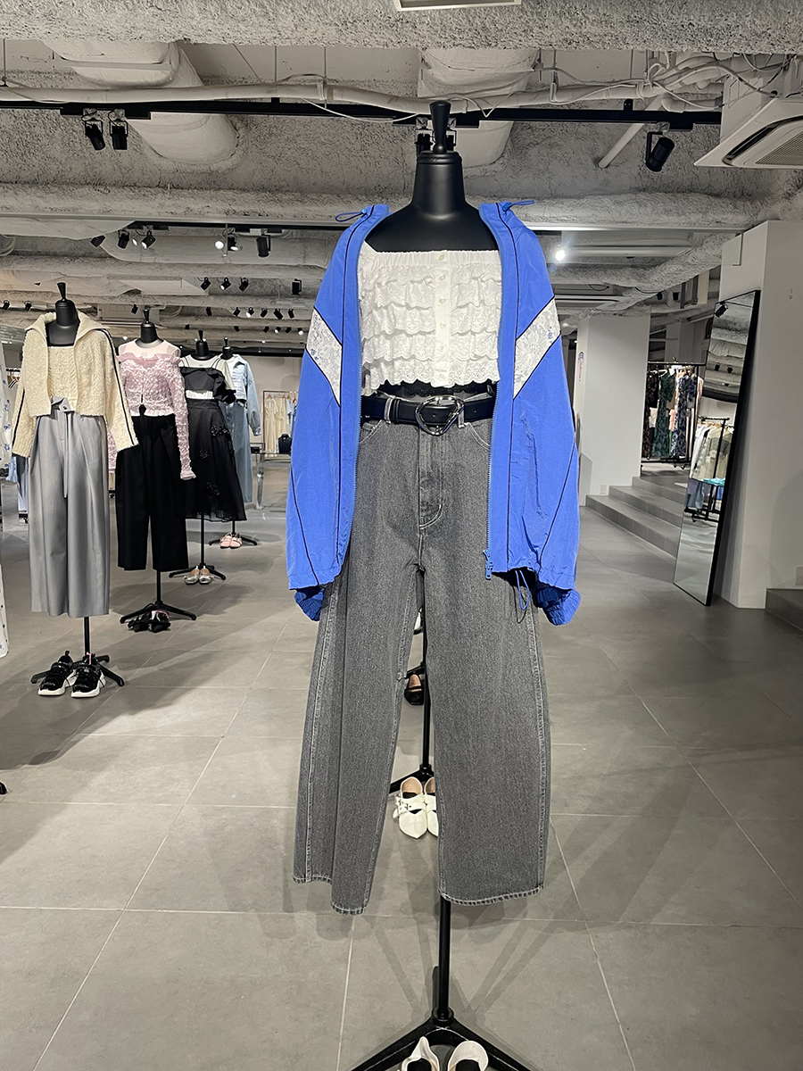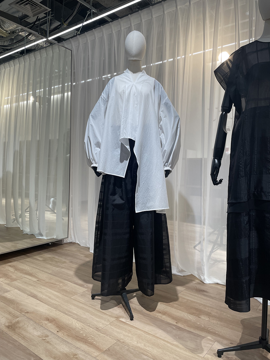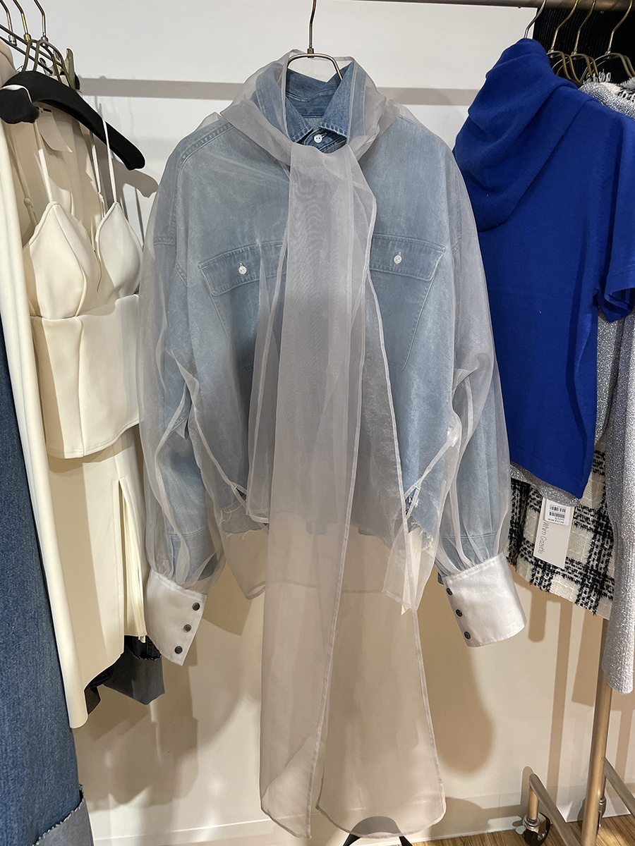 チュールやオーガンジー、ハイゲージニットなどのシアーアイテムの勢いは2024年春夏も継続している。透け感ブラウスやスカートといったよくある提案だけでなく、24年春夏はアウターやフーディーなどにも透け素材が広がっているのが注目ポイント。透け素材から肌を見せる着こなしが従来の主流だが、意外性のあるレイヤードで下に着た服を透けさせる提案が新しく、店頭でも提案のしがいがありそうだ。