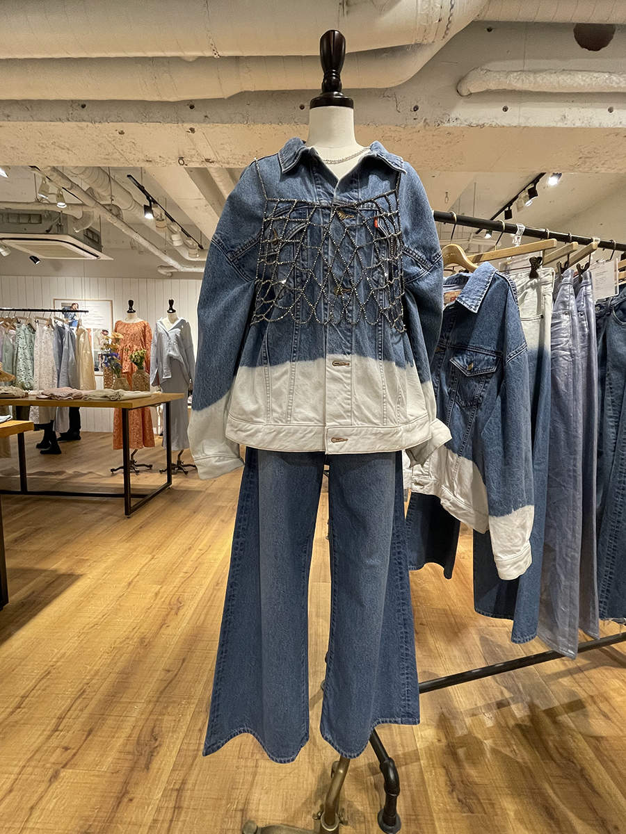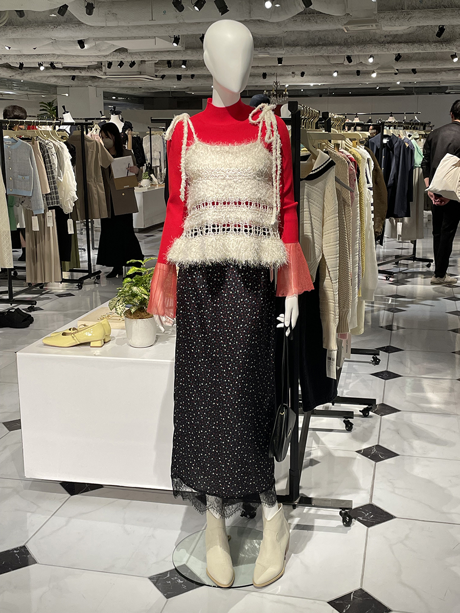 定番の再強化の流れもあって、ここ数年続いているデニムの流れがさらに拡大。ジーンズだけでなく、アウターやドレスなど、デニムアイテムのバリエーションを広げて各社変化を持たせている。2023年春夏に火がつき、今秋冬も大ヒット中のカーゴパンツは、今の売れ筋であるスポーティーなシャカシャカ素材に加えて、エレガントなスタイリングも浸透しそうだ。カーゴデザインのスカートも増えている。
