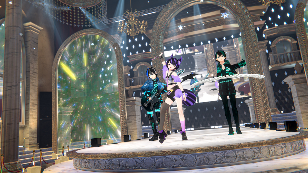 Wi-Fiを有線に変え、再度ジョイン。いろんな設定を再び案内係の人に教えてもらって、なんとかオープニングアクトのライブ演奏に間に合った。画像では観客が見えているが、ショーの間は演者以外は「見えない」設定にしているため、ほぼ貸切な気分で、最前列でしっかりショーが楽しめる。席はナシ。アバターは立ち見姿だが、私自身は家のベンチソファーに座りつつ、PCを前にVRゴーグルをかぶって、コントローラー両手にいろいろ必死。