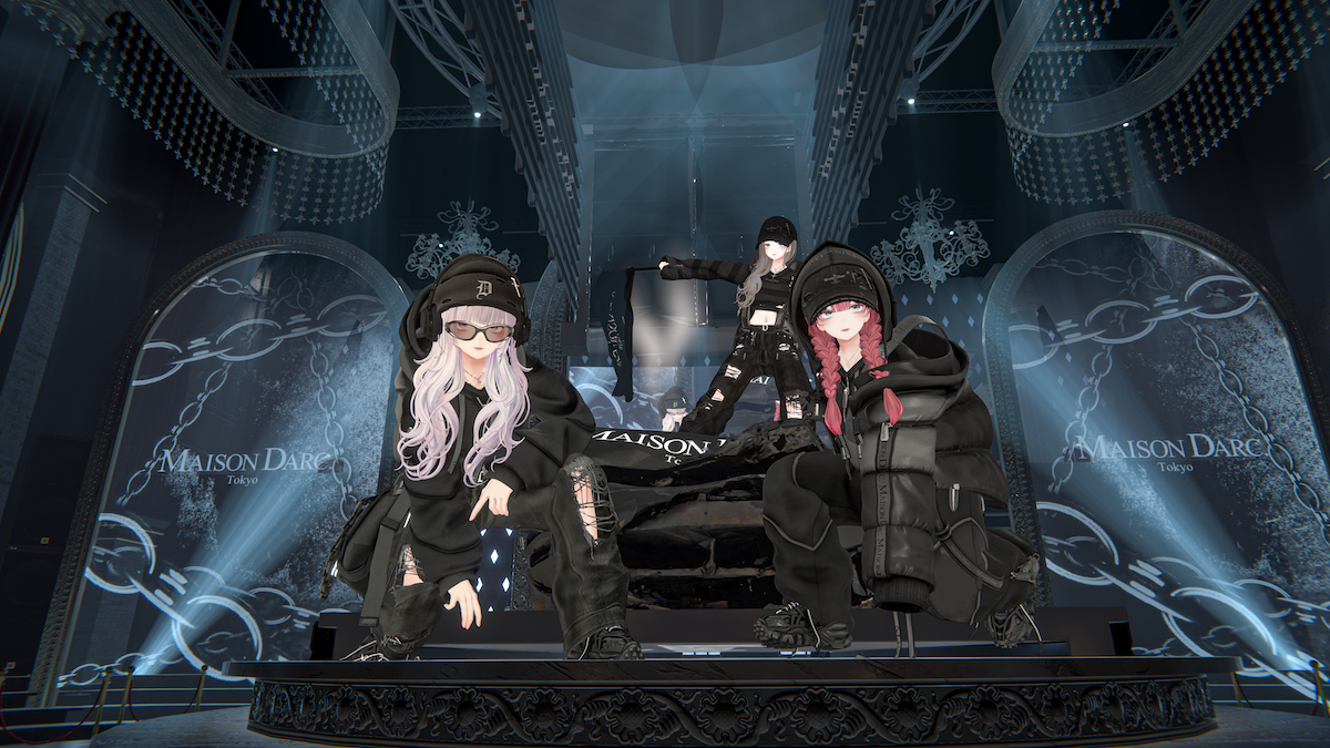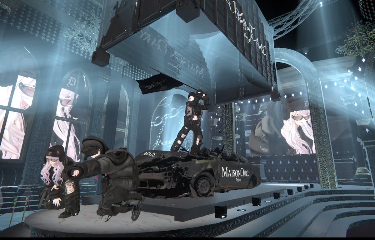後半の山場はすでにブランドとして人気が高い「エクステンションクロージング(EXTENSION CLOTHING)」のオーナー、アルティメットゆいによる新ラグジュアリーブランド「メゾンダーク(MAISON DARC.)」のお披露目。天井から巨大コンテナが降りてきて、中から車と3人のモデルが出てくる演出はさすがバーチャル。大きな旗を振るモデルの動きもカッコいい。リアルでの商品展開も視野に入れているそうで、今後の展開に注目だ。