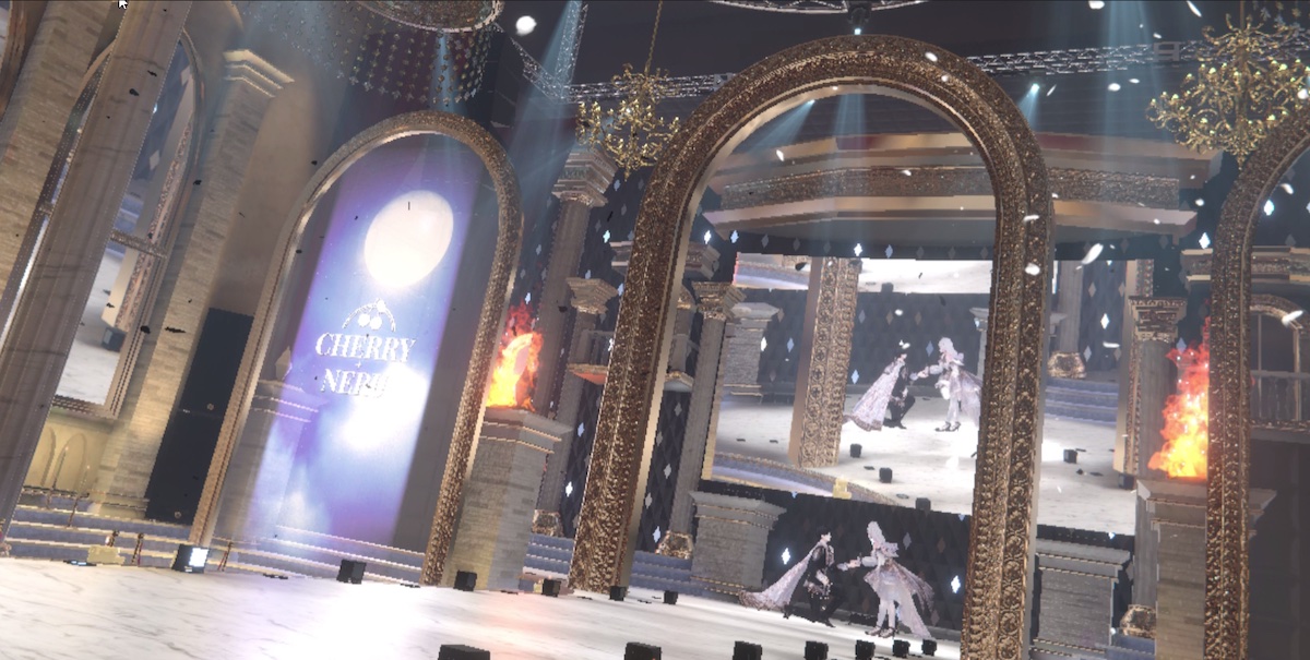 会場ワールドはヨーロッパの宮殿風。イケメンアバターのスタッフが迎えてくれる。中に案内されるまで、庭で待つ。