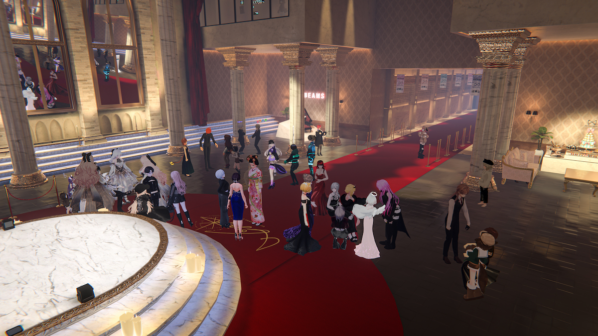 奥の扉を通り抜け、いよいよランウエイのある部屋へ。レッドカーペットが敷かれた大広間にランウエイがあり、観客はその周りを囲む。後ろの壁側には協賛するビームスの新作デジタルツイン衣装が展示されている。ショーが始まるまで歓談タイム。ゲスト同士、互いの衣装を褒め合ったり、会場について感想を言ったりする。これもリアルと一緒。と、ここで私の視界が固まった……。ワールドのデータが重すぎて処理が追いつかない!ここで脱落……。再度入り直すことに。どうしよう!始まってしまう!