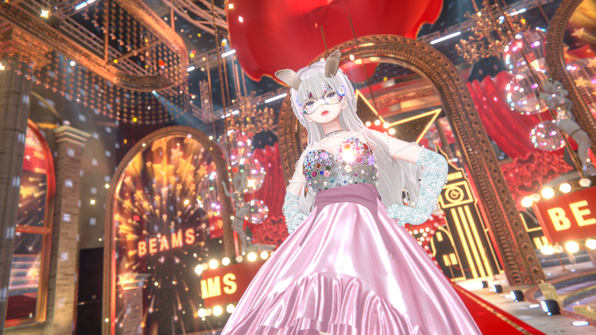 ランウエイに登場したのは、ボディースーツの上にオーバースカートを重ねた衣装で、仮面舞踏会を彷彿とさせるマスクも。華やかさ、キラキラ感で、バーチャルファッションの楽しさを大いに表現した。リアルでファッションをけん引するビームスならではの細部へのこだわりと、バーチャルだからできる突き抜け感で、見事な存在感を放っていた。私はそれをスマホで見つつ、なんとかPCで再ジョイン。VRで体験したかった……。