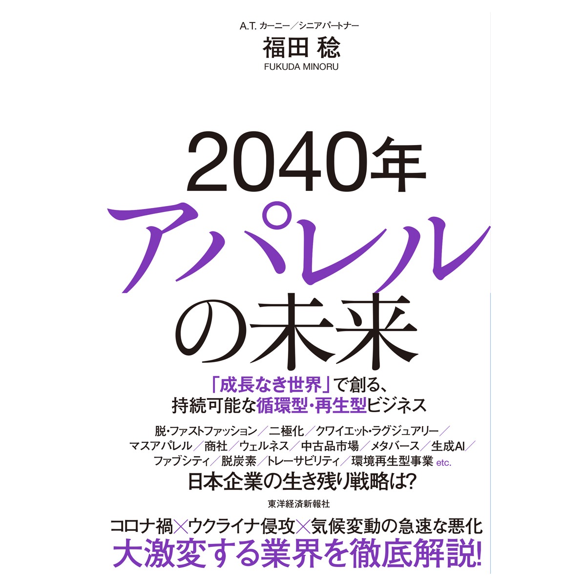 ベストセラー「2030アパレルの未来」の著者でコンサルタントの福田稔A.T.カーニー シニアパートナーがこのほど、新刊「2040年アパレルの未来」を東洋経済新報社から出版した。前著は「日本企業が半分になる日」という副題の衝撃もあり、7刷の話題本となった。あれから5年。今回つけた副題は「成長なき世界で創る、持続可能な循環型・再生型ビジネス」である。グローバルの最先端事情を踏まえた日本企業の生き残りの戦略について聞いた。(全文はこちら)