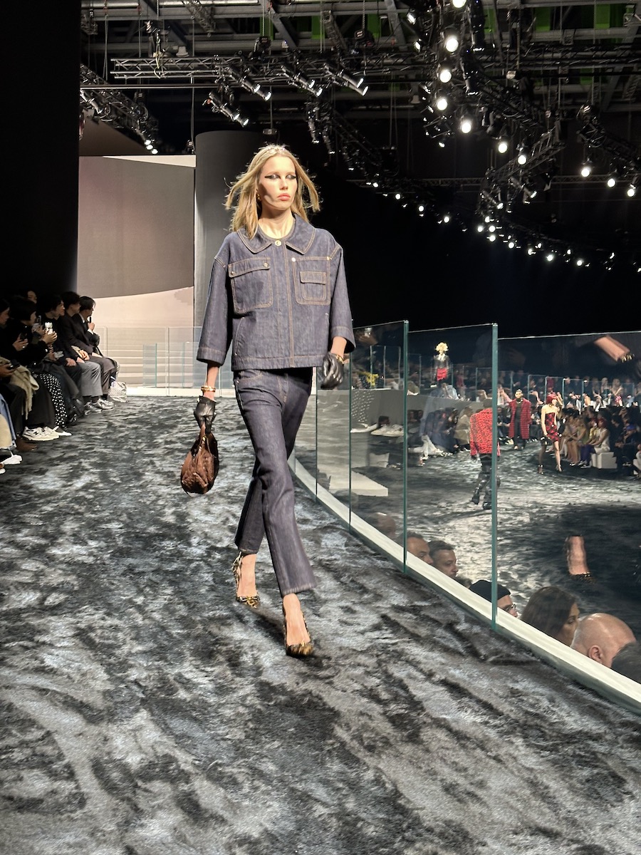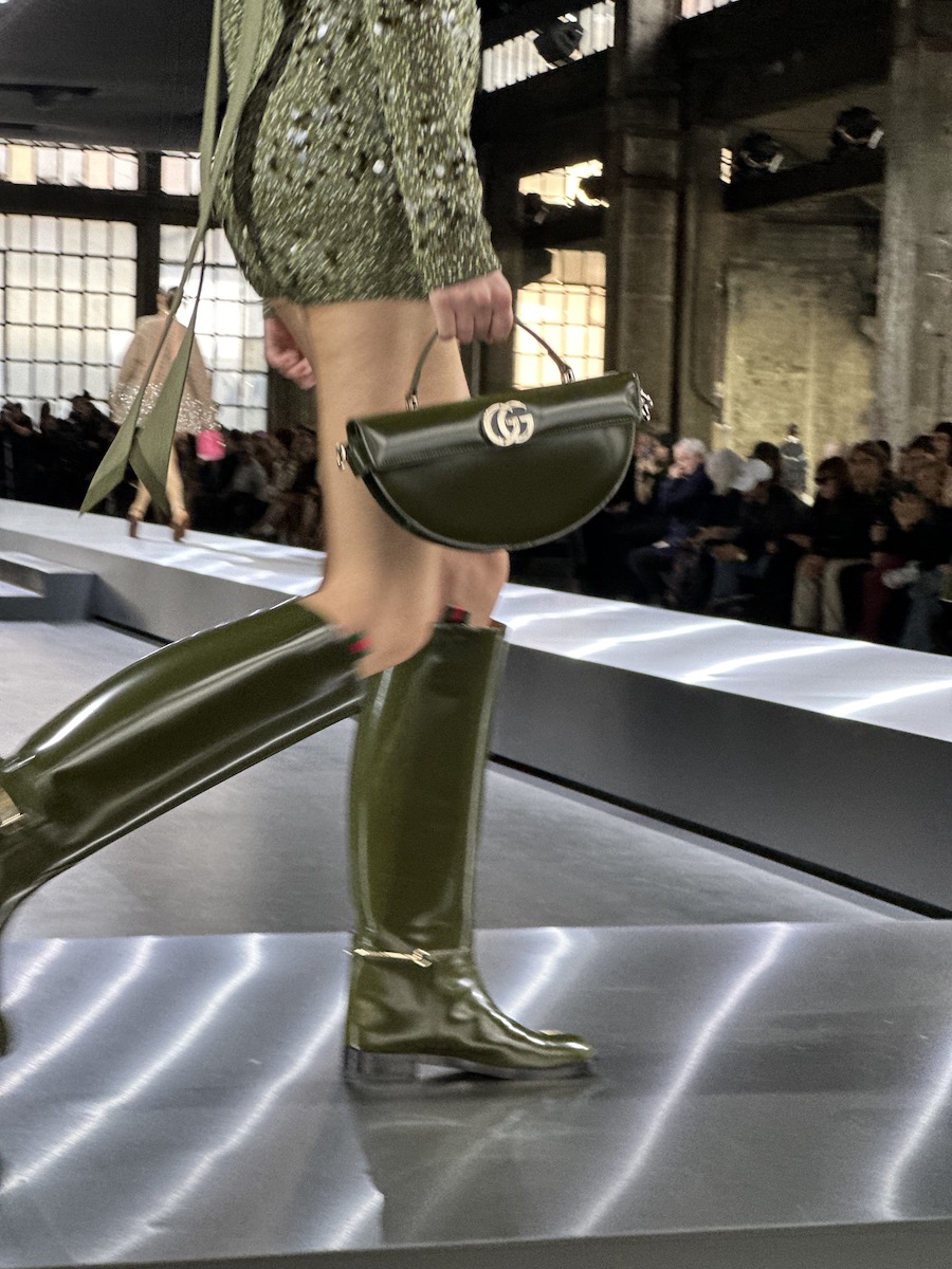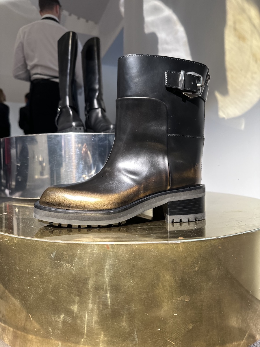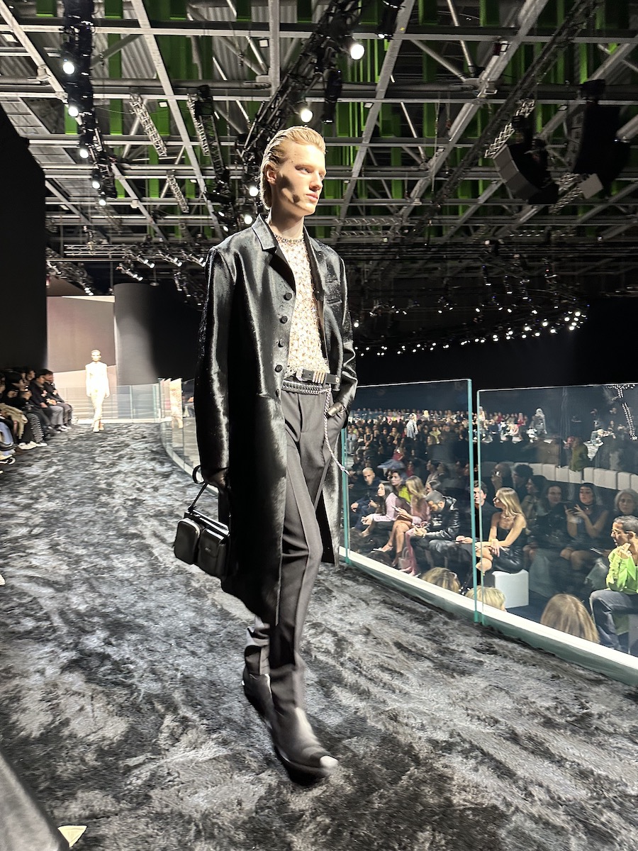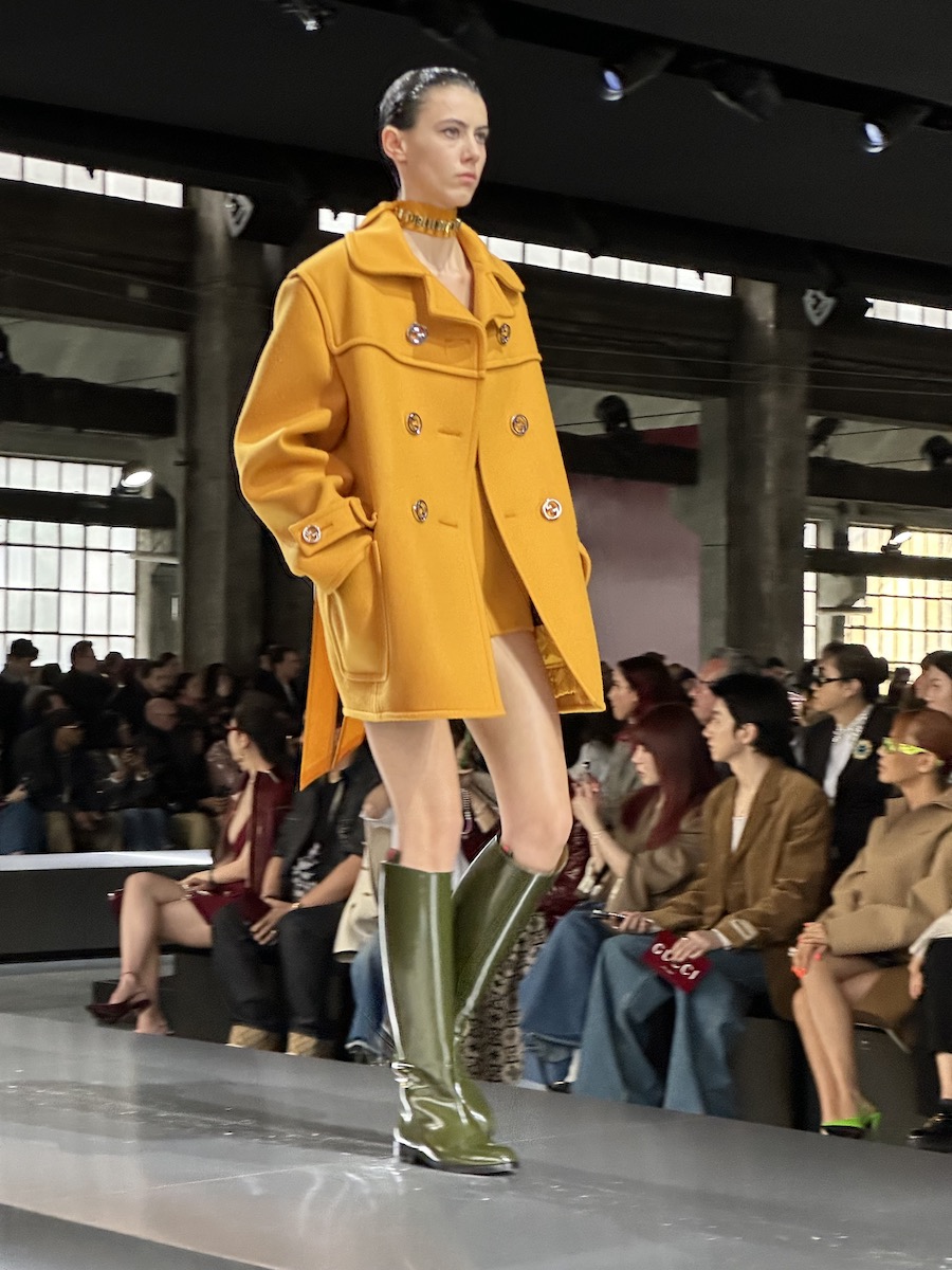 マッテオはイタリア・マルケ生まれで、テーラリングとアウターウエア、レザーウエアが得意といいます。確かに、前任のヴァルター・キアッポーニ(Walter Chiapponi)は、どちらかと言えば布帛が得意で若干フェミニンなイメージがありましたが(だからこそ「ブルマリン(BLUMARINE)」への移籍は妥当だったのかも)、マッテオはよりジェンダーレス。リラックスシルエットのパンツ、トレンチ&チェスターコート、ドレープが美しいベスト、サファリジャケットまで、さまざまなアイテムをレザーで提案しています。レザーで言えば、乗馬ブーツも美しかった。アイコンのドライビングシューズ“ゴンミーニ”は、レザーフリンジで覆われました。