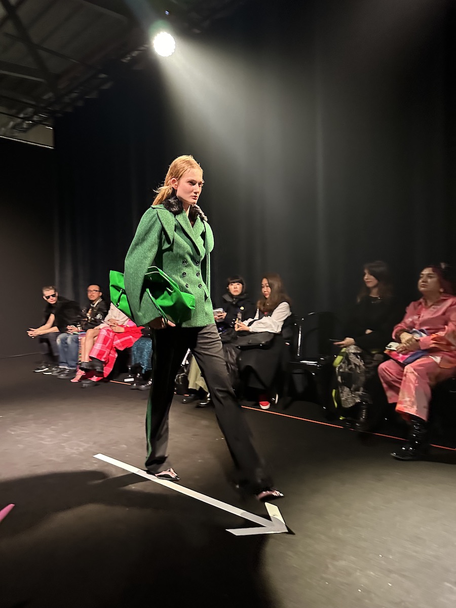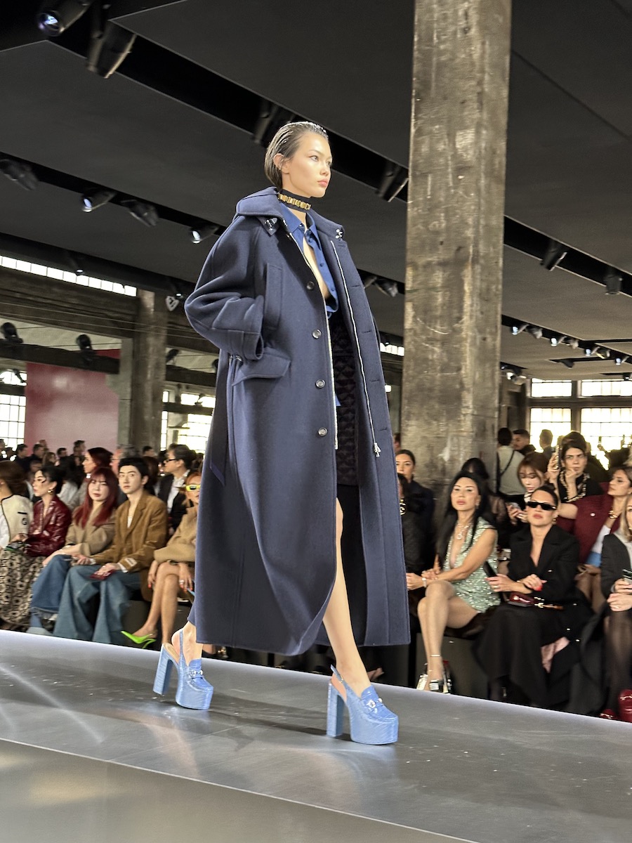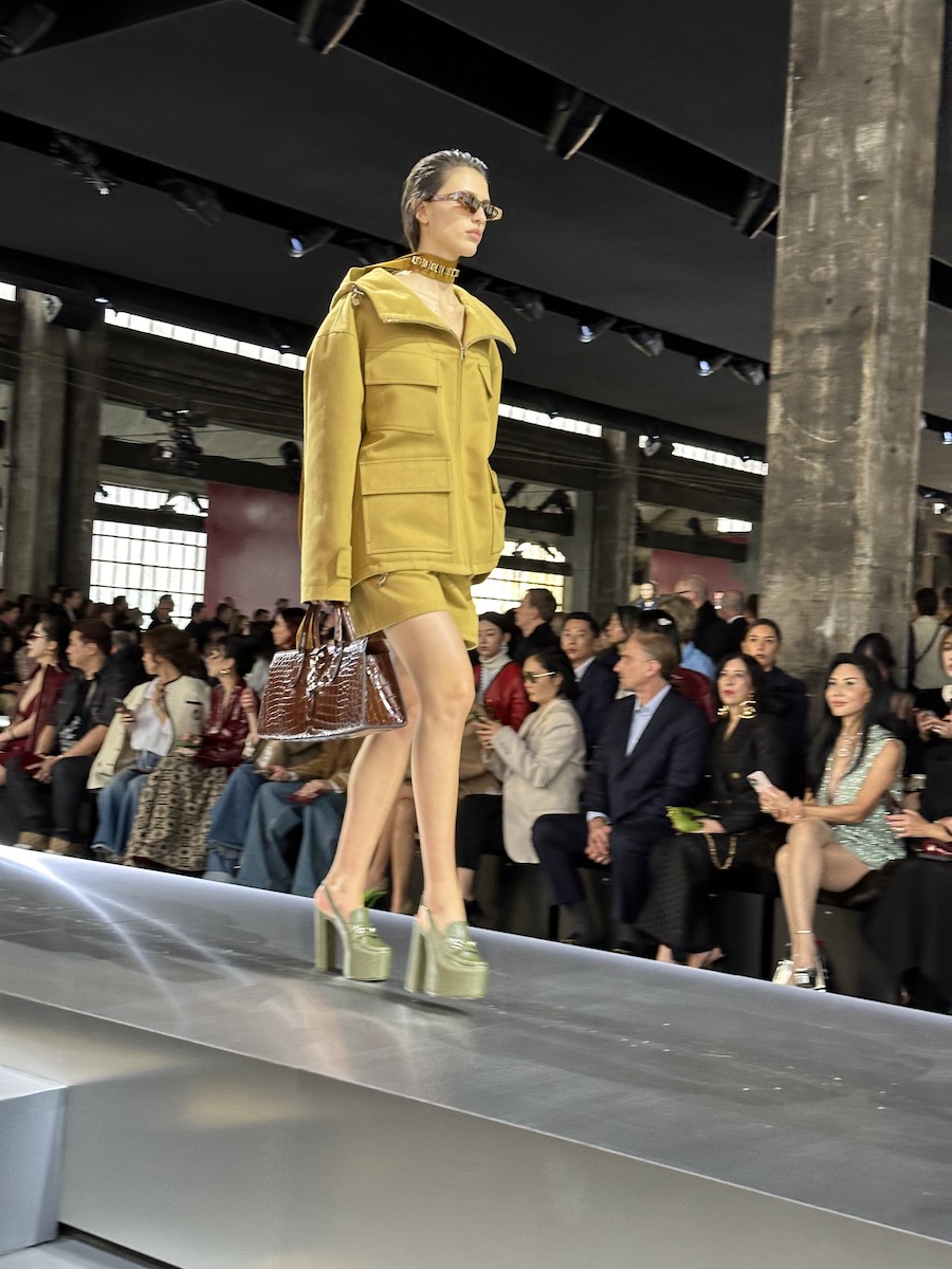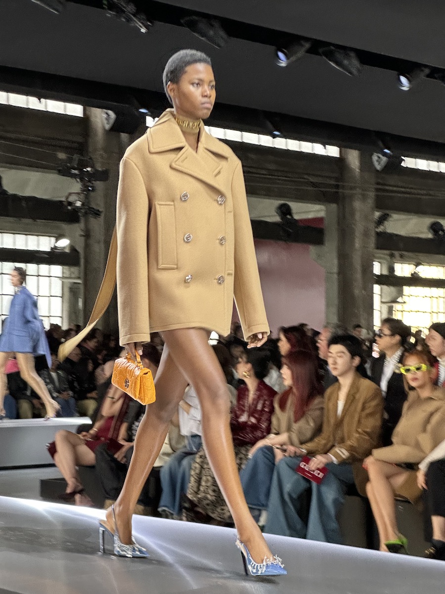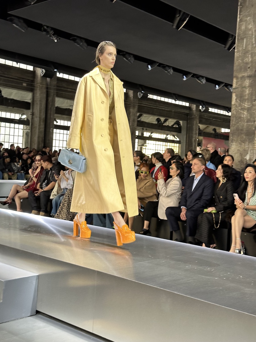 村上:本日朝イチの「トッズ」は、テンションが上がりましたね!会場は、ミラノ市内を縦横無尽に走る路面電車、トラムの停車場。会場では、中でもミラノ市内を大横断する「1」番線が出迎えてくれて、一人で勝手に感動しました。ちょっと早めに会場入りして、アンバサダーの榮倉奈々さんらセレブを撮影。そして、マッテオ・タンブリーニ(Matteo Tamburini)のファースト・コレクションが始まりました。