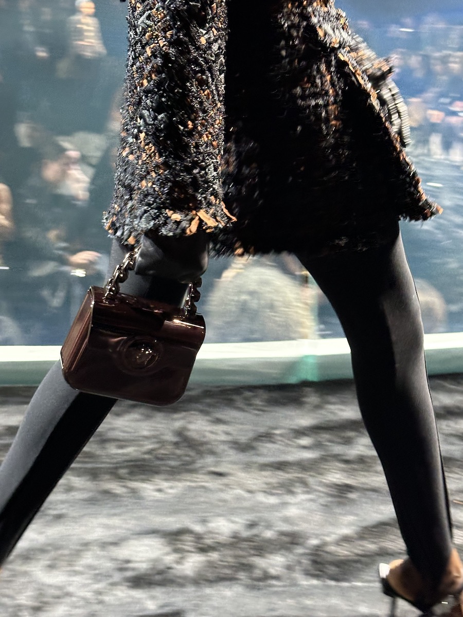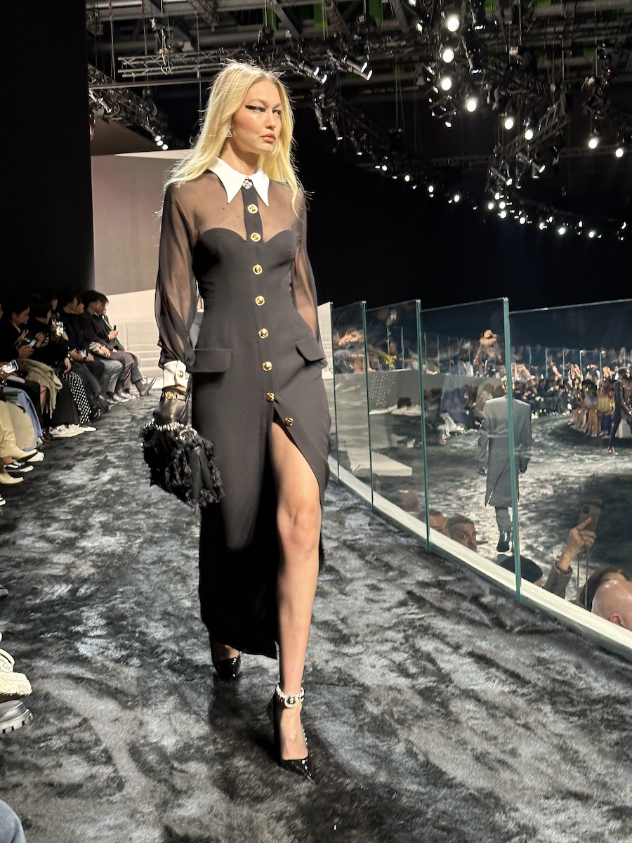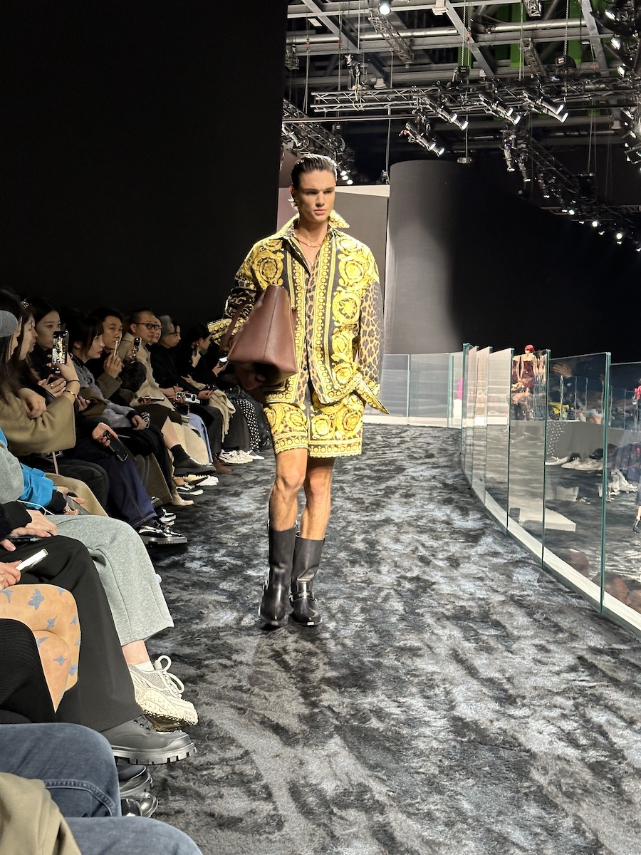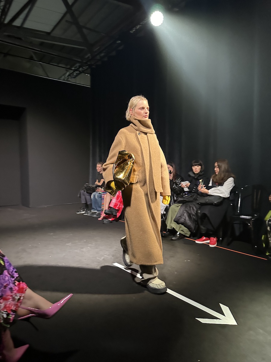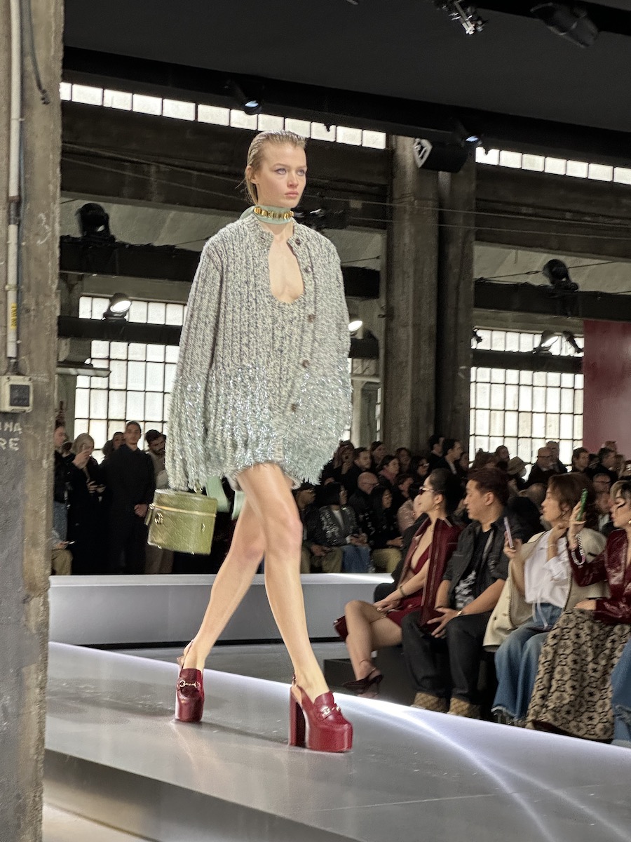 村上:本日朝イチの「トッズ」は、テンションが上がりましたね!会場は、ミラノ市内を縦横無尽に走る路面電車、トラムの停車場。会場では、中でもミラノ市内を大横断する「1」番線が出迎えてくれて、一人で勝手に感動しました。ちょっと早めに会場入りして、アンバサダーの榮倉奈々さんらセレブを撮影。そして、マッテオ・タンブリーニ(Matteo Tamburini)のファースト・コレクションが始まりました。