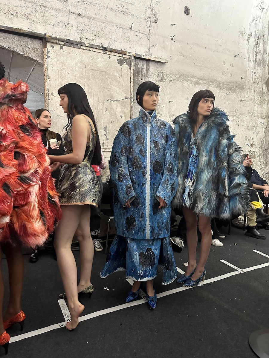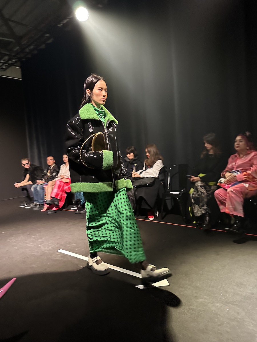 木村:ちょっと難易度高そうでしたね。インスピレーション源は、イギリスのロックバンド、スージー・アンド・ザ・バンシーズ(Siouxsie And The Banshees)やシンガーソングライターのニコ(NICO)ら1970〜80年代の女性アイコンだそうです。センシュアルなコルセットドレスには、赤いカエルのモチーフを中央に。きっとインスピレーション源のアイコン達に通ずるものなのだと想像しますが、ちょっとファニーに見えてしまい受け止め方に戸惑いました。アクセサリー感覚でつけられる細いタイは気になったかも。