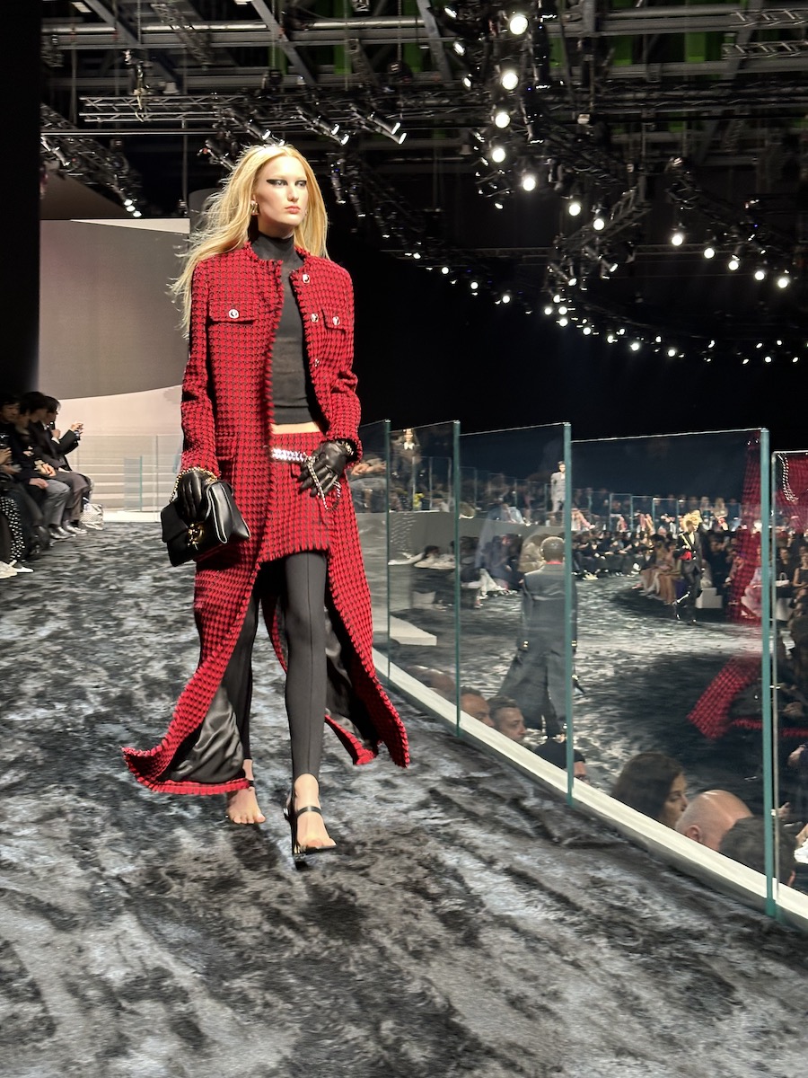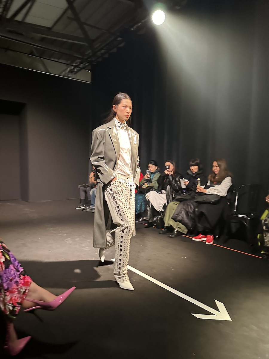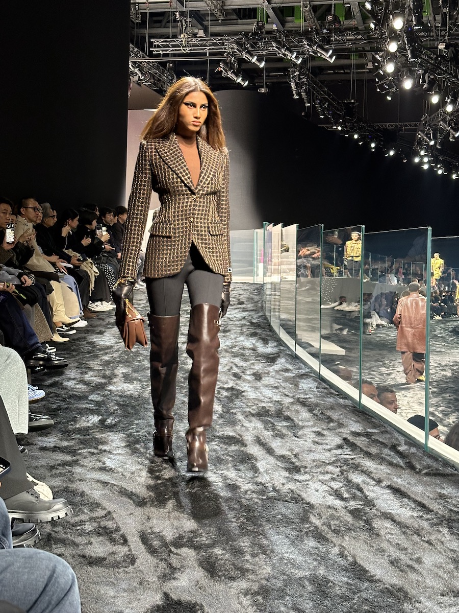 村上:「スポーツマックス(SPORTMAX)」は、不思議なコレクションでした。フォーマルを軸に、ロックやスポーツ、そしてウエスタンのムードをまじえました。例えばLOOK4は、ピークドラペルのジャケットを、レザーで作ったボクシングパンツにイン!!です。日本や韓国では「ブロケットコア」、スポーツアイテムを取り入れた“ブロークコア”と、ガーリーな“コケット”テイストのミックスが流行っていますが、一歩先を行った感じでしょうか?ボクシングパンツの装いなら、シトウレイちゃんに聞いてもいいかも(笑)。やっぱりピークドラペルのダブルのジャケットに、ハイゲージニットのコルセットを巻いて、なぜか下にはカウボーイパンツを重ねるスタイルにも驚きました。全体は、シャープでマスキュリンなジャケットにコルセットなどでウエストマークしたり、ベアトップドレスをフェザーやチュール、PVCっぽい艶感がある素材で彩ったりと“女っぷり”たっぷりですが、なぜかいきなり、スポーツ&ウエスタン。パンクやロックなどの音楽が表現してきた、反骨精神を体現しているのかもしれません。フツーじゃ終わらないよ、みたいな。