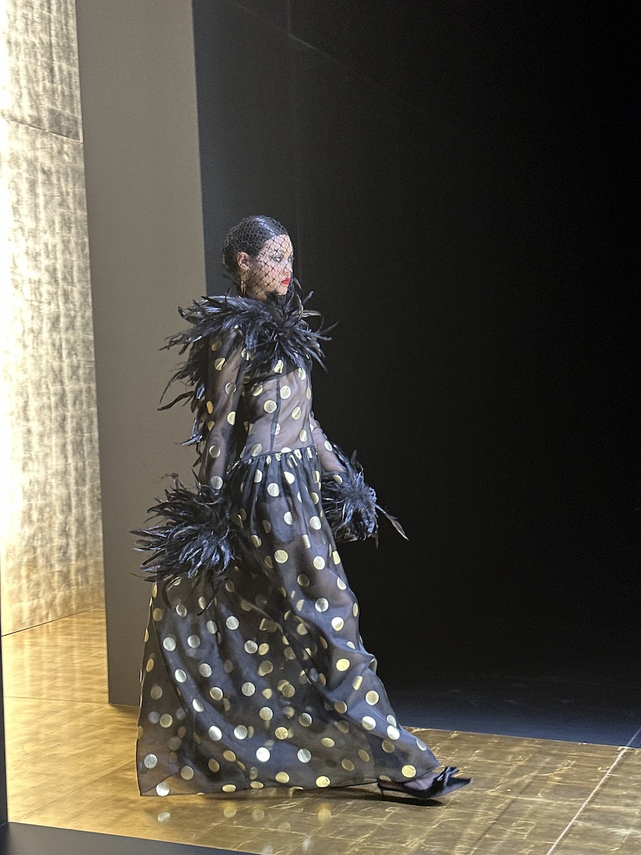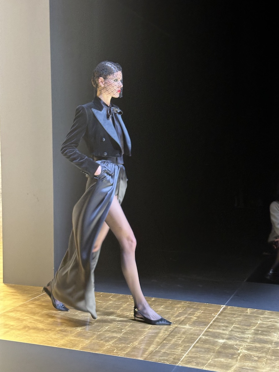 サテンのラペルにくるみボタン、そして緩やかにくびれたウエストと、時には強いショルダーライン。メンズのテーラードにも自信を持っているブランドだからこそのタキシードスタイルに、これまた得意なレースやシフォン、フィッシュネットを組み合わせ、まさに「ドルチェ&ガッバーナ」の十八番が組み合わさった最強コンボな印象があります。遠くからでもわかるシルクサテンの滑らかさと、チュールの目の細かさからは、他よりワンランク上のラグジュアリー感が漂っていたし、そんなチュールを使ったボウブラウスの誇張したボリューム感もブランドらしい。ファンにはたまらないコレクションだったでしょう。