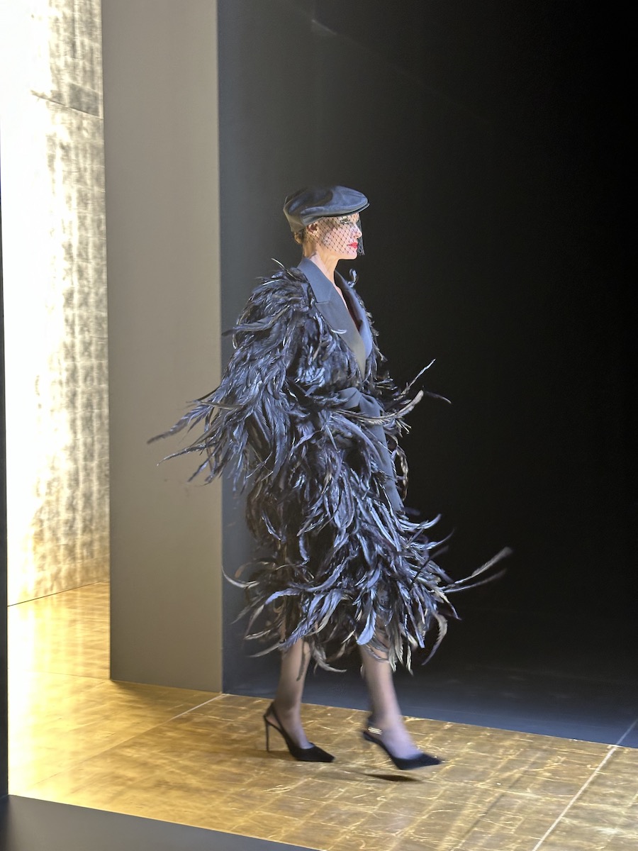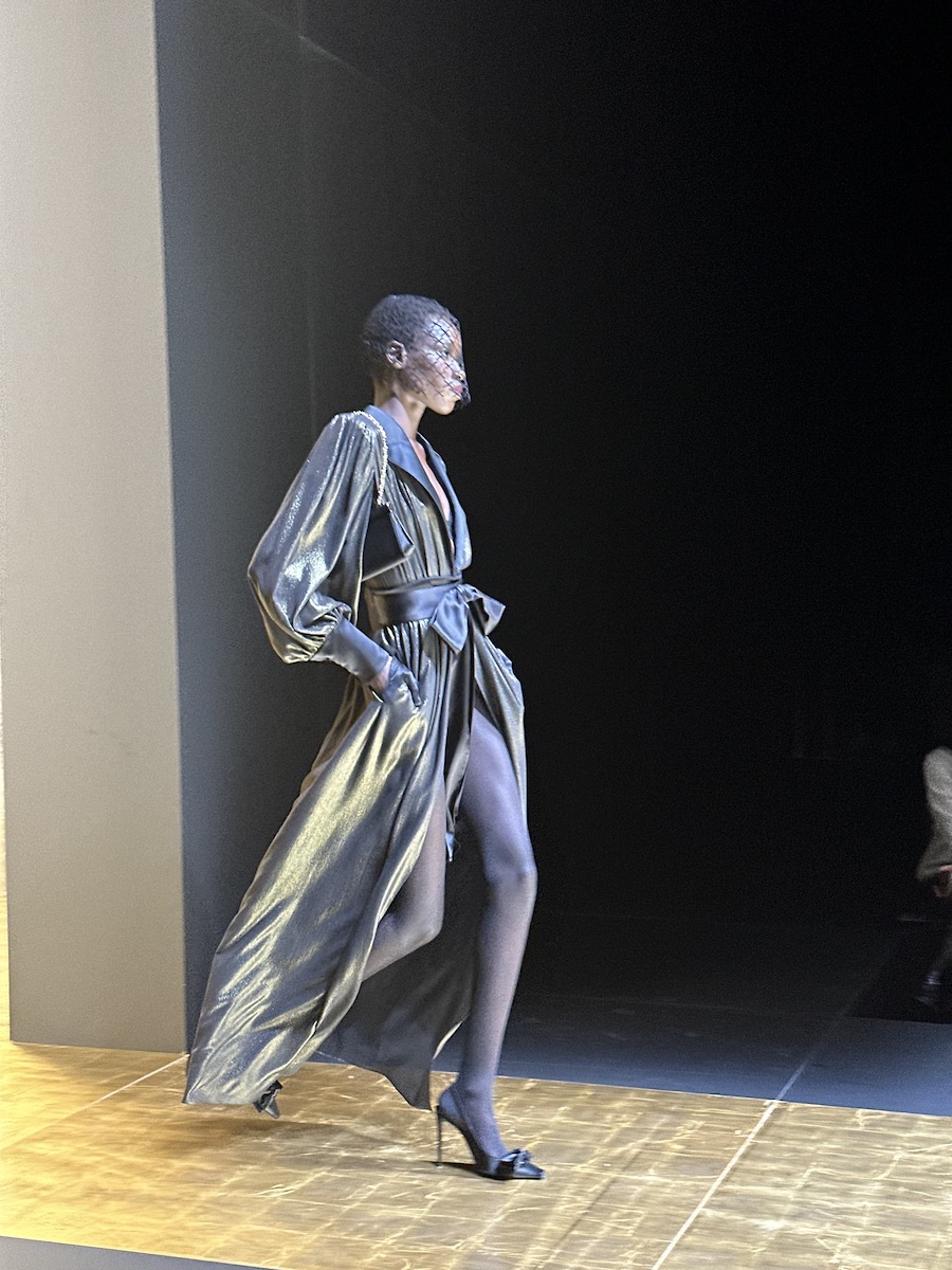 木村:「フェラガモ」のショーは、会場が真っ暗に暗転し心臓にガンガン響く爆音のBGMでスタート。ミニマルな装飾の会場だからこそ、また一歩洗練度が増したコレクションが映えていました。今季は同ブランドの創業期でもある1920年代の文化がヒントになったそう。当時の直線的でローウエストなシルエットがベースです。深いVカットのシースルードレスやブラウスなどドレッシーなアイテムに太いベルトが印象的なピーコートを羽織るルックは、禁酒法があった当時、ジャズとお酒を楽しみにこそこそと外出する人々の装いと重ねています。表からは見えない欲や秘密を感じさせるという意味では、マクシミリアンのフェティッシュさは健在です。