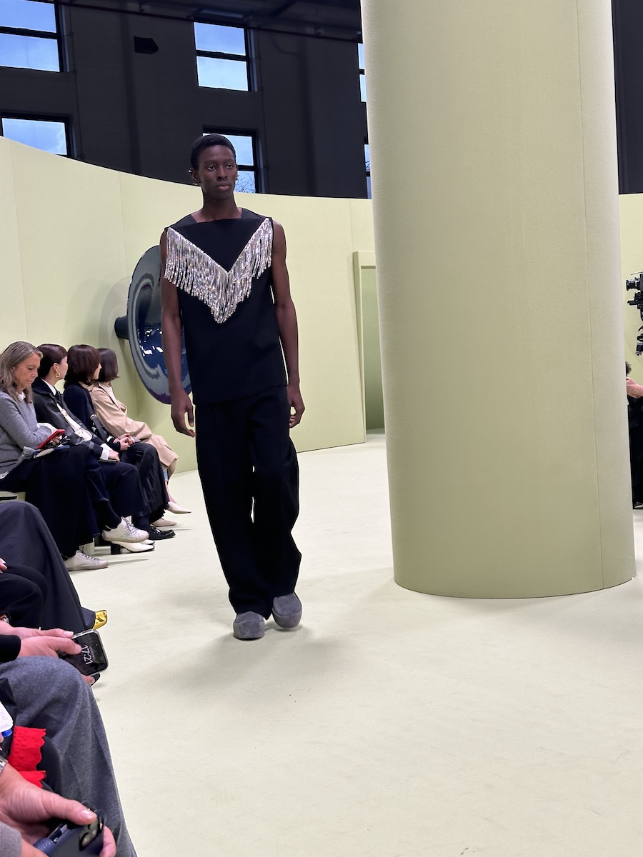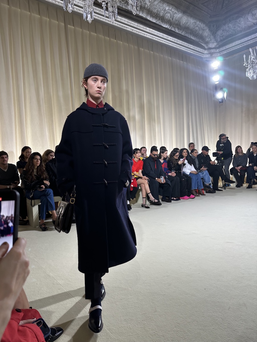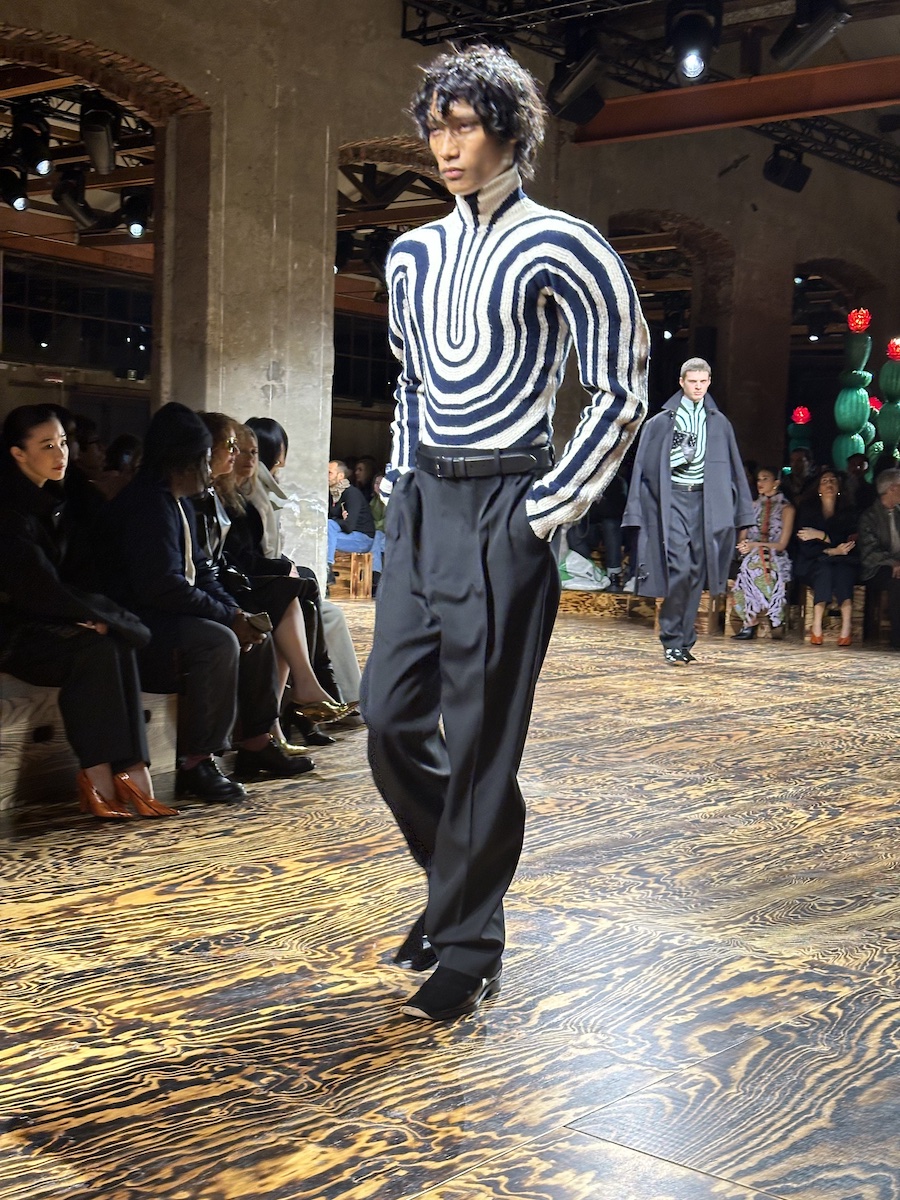 木村:「ミッソーニ(MISSONI)」は、1時間強遅れてスタート。待ち時間の間にゲストを観察していましたが、家族連れも多く顧客を中心に招待しているのかな?と思いました。「ミッソーニ」はフィリッポ・グラツィオーリ(Filippo Grazioli)=クリエイティブ・ディレクターが2022年3月に就任して以降、若返りに舵を切っています。だからといって、ゲストに「ミッソーニ」を今っぽく着こなしているヤングがいるわけでもなく、ちょっとどこか懐かしい雰囲気を感じてしまいます。「ミッソーニ」にとっての理想の若返りのあり方ってなんだろうと考えながら待ち時間を過ごしました。