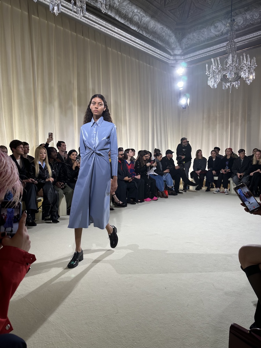 村上:「バリー(BALLY)」は、本格始動!と言えるでしょう。デザイン・ディレクターは、シモーネ・ベロッティ(Simone Bellotti)。正直前回は、準備期間も十分ではなかったのでしょう。素材もデザインも洗練しきれていなかったり、方向性が定まっていない印象でしたが、今回はだいぶ照準が定まってきたし、素材も格段に向上し、ジャケットやバッグの“面構え”がよくなってきたように思います。きっとスイスでは貴重だろう青空の色のレザードレスは、胸元でレザーを結んでデザインにしています。ガラス加工のレザーなのに、結べるほど柔らかいなんて驚き。今シーズンは各ブランドともレザーを多用していますが、いずれも軽くて柔らかい物ばかりです。