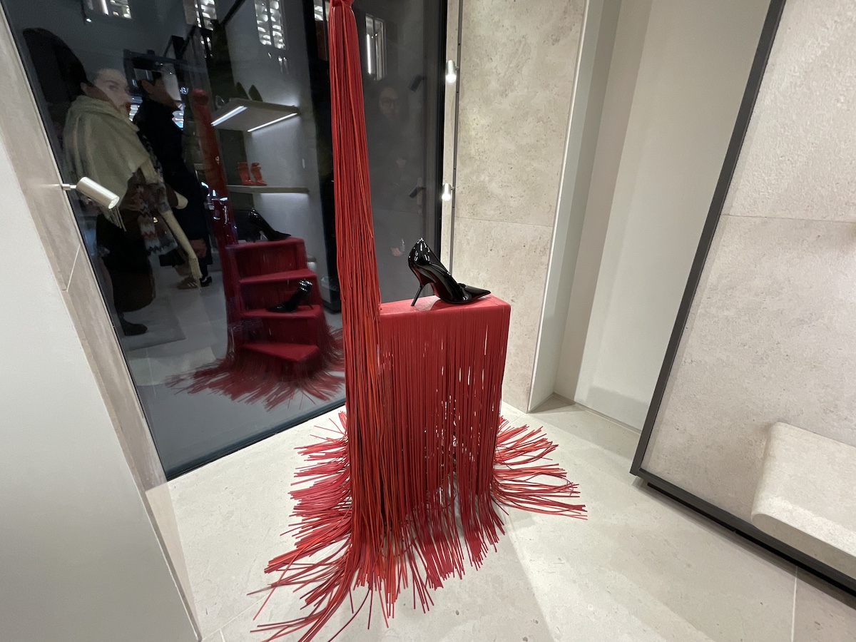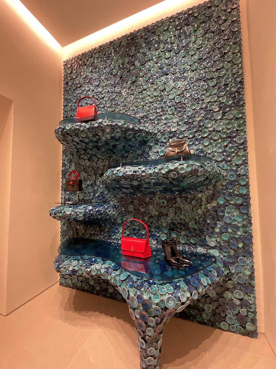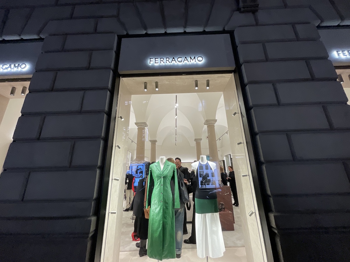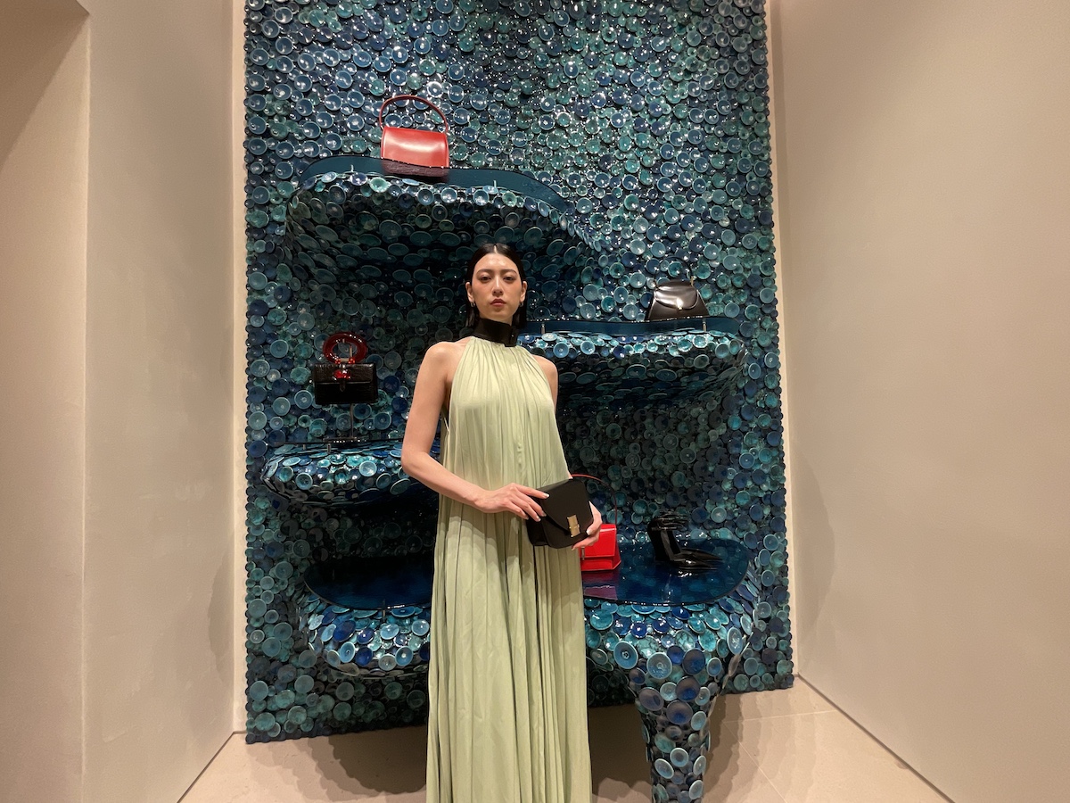 木村:モンテナポレオーネにある「フェラガモ」旗艦店がこの日リニューアルしたということで、レセプションパーティーに行ってきました。この店は100年近い歴史のある建物だそうで、かつてはイタリア統一運動の指導者の一人であるエミリオ・モロジーニが拠点としミラノの文化や政治において重要な場所だったそうです。建築家のヴィンセント・ヴァン・ダイセンを起用し、ありのままを生かしたミニマルでエレガントな空間でした。店内には、さまざまなアーティストとコラボし、海を思わせる陶器で作った什器や「フェラガモ」の工場で出た革の端材をフリンジでおおったスツールなどが置かれ「フェラガモ」の構築的な商品を引き立てていました。ショーにも来場していた三吉彩花さんの姿も。「フェラガモ」のドレスがお似合いでした。