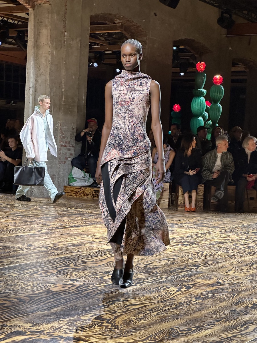 一方で、大勢に愛されるための洗練のムードは格段に増しました。序盤のオリーブグリーンに染まったミリタリー由来のスタイルから、アウターウエアやジャケットは丁寧に仕立て、レザーのシャツやボトムスも柔らかそうです。チュールやシルクジャージーのドレスも優雅。特にシルクタフタのボディ部分を経て、チュールのスカートの裾にはフリンジが垂れ下がり躍動的に揺れるドレスからは、「若手」のステージをそろそろ卒業して円熟味を増していくだろうマクシミリアンのさらなる可能性を感じさせます。そしてアイコンバッグの“ハグ”は、小さなクラッチタイプからミディアムサイズまで、バリエーション豊かです。