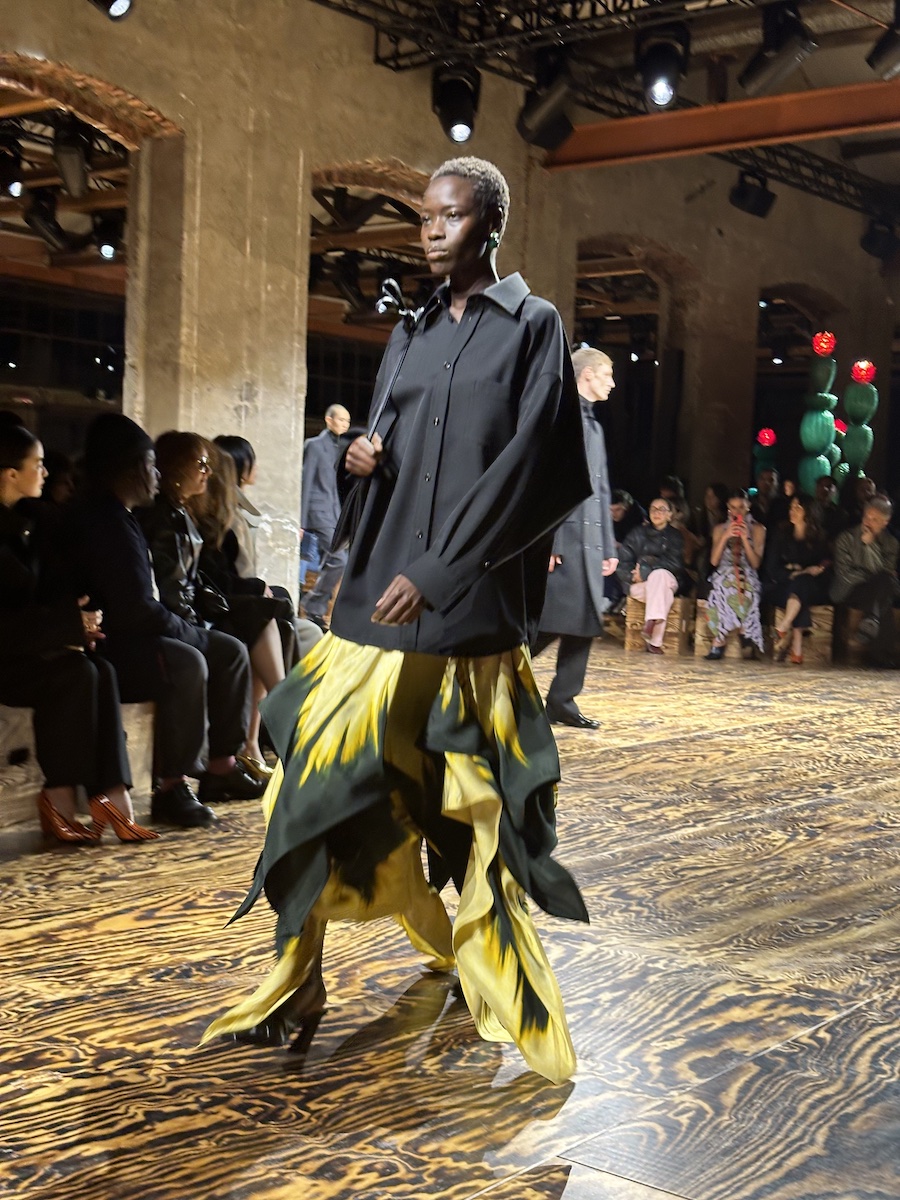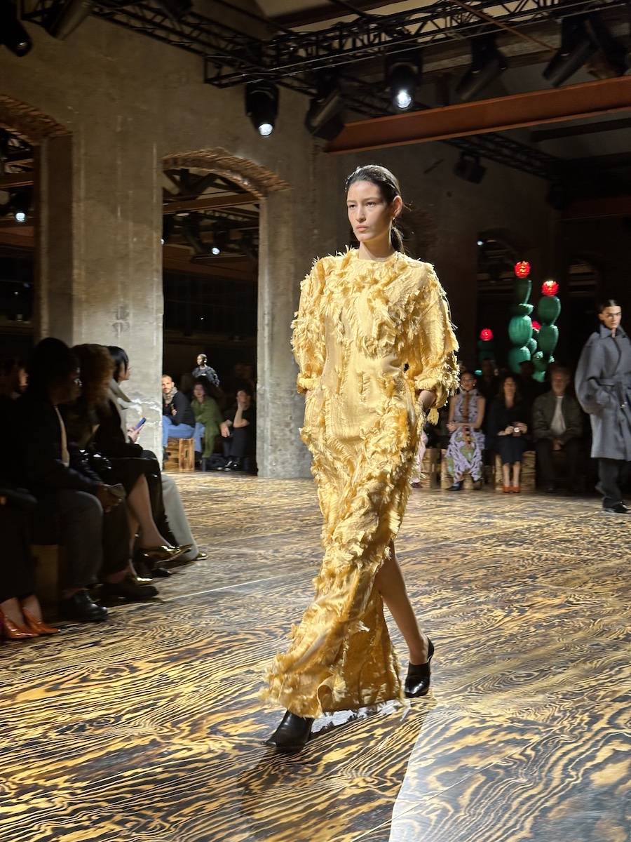 村上:4日目は、「エルマンノ シェルヴィーノ(ERMANNO SCERVINO)」からスタートですね。今回は、ちょっと“粘っこい”コレクションな気がしました。テノールの男性歌手が熱唱するBGMの影響もあるでしょうか(笑)?