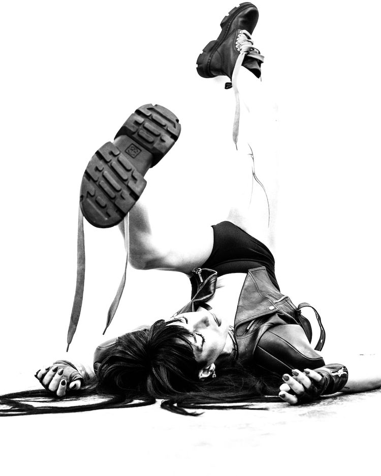 “1918ブーツ”は18ホールで、同じくドラマチックなラップアラウンドシューレース、ブラックとパールのヒールループと両ブーツとも厚みのあるタンを備え、しなやかなルナレザーを使用することで無骨なブルータリズムの構造に対し柔らかな印象を与える。
