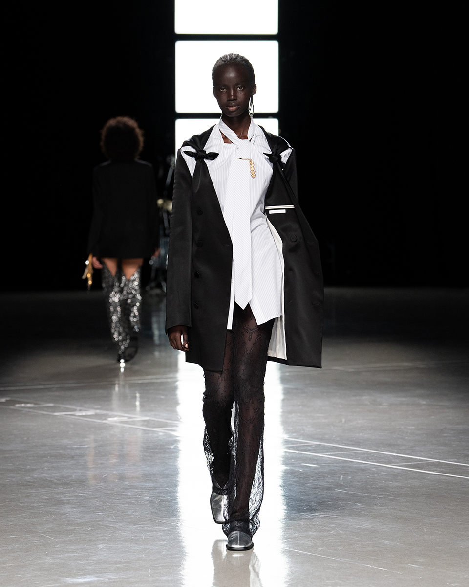 ジェンダーの既成概念にいち早く一石を投じて女性の共感を得てきた「フェティコ(FETICO)」は、本音・本心を語り、問いかけるクリエイションの度合いを深めている。今シーズンは、映画「アダムス・ファミリー(The Addams Family)」の主人公一家の長女ウェンズデーなどに着目。彼女が「残酷で陰湿」なのを認めた上で、「人と異なることを恐れない強さを教えてくれた」と語り、「好きなものを大切にすることは、自分自身を大切にしていることと同じ。好きなことに素直な自分は、より愛しく思える。お気に入りと共に人生を歩むことは、何より幸せなこと」と続けて、自分を慈しむボディー・ポジティブの発想を啓蒙してきた自身のコレクションと関連づけた。ファーストルックは、ネットフリックス(Netflix)のドラマ「ウェンズデー(Wednesday)」でいよいよ主役となった彼女が身にまといそうな、漆黒のドレス。カットオフした十文字はゴスなイメージを強調。ともすれば共感し難い、陰湿な世界だ。しかし誰よりも先に、これまで上の世代がフタをしてきたジェンダーに向き合い問いかけてきた「フェティコ」からの、「世間は陰湿と思うかもしれないけれど、私はこれが好き。どうですか?」と“さらけ出し”てくるような問いかけは、ファンはもちろん、ブランドの挑戦を知っている人たちの心を打った。
