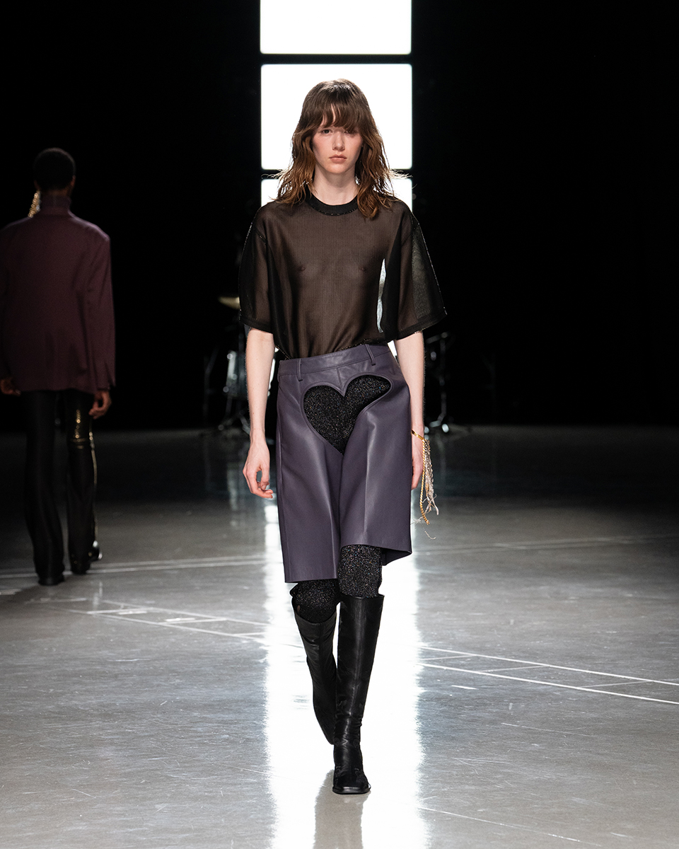 同じようにジェンダーに向き合ったのは、「カナコ サカイ(KANAKO SAKAI)」だ。22年春夏にデビューしたブランドはこれまで、産地に赴き、日本の職人技や伝統工芸をエレガントに表現してきた。「このブランドは、日本の産地を守る優等生」と、勝手に思い込んでいた人もいるだろう。そんな優等生は今回、コーンブラのビスチェや股の部分をハート形にくり抜いたレザーショーツなどを提案。勝手に「優等生」と思い込んでいた人は、「まさかこんなに過激に性を表現するなんて」と驚いただろうか。しかし「カナコ サカイ」は、ジェンダーの既成概念に反旗を翻したり、ファイティングポーズを取ったりすることで向き合いたかったわけではない。好きなものを、好きなように、好きな時に作りたいだけというメッセージを込めている。むしろ今シーズンのクリエイションを反旗やファイティングポーズの結果と捉えられないか心配しているような気配だ。その姿勢は、臆病と映るだろうか?いやむしろ彼女たちの世代にとって、「女性性」とは、時には傾倒するし、時にはあまり意識しないもの。そのさじ加減さえ、自分が、自由に決めたいのだ。そして、自分で決めたいにもかかわらず、そのさじ加減が人にはどう映るのか?が気になっているところが人間らしい。「カナコ サカイ」は、こうした等身大の迷いや葛藤さえ、“さらけ出せ”ば良いと思う。