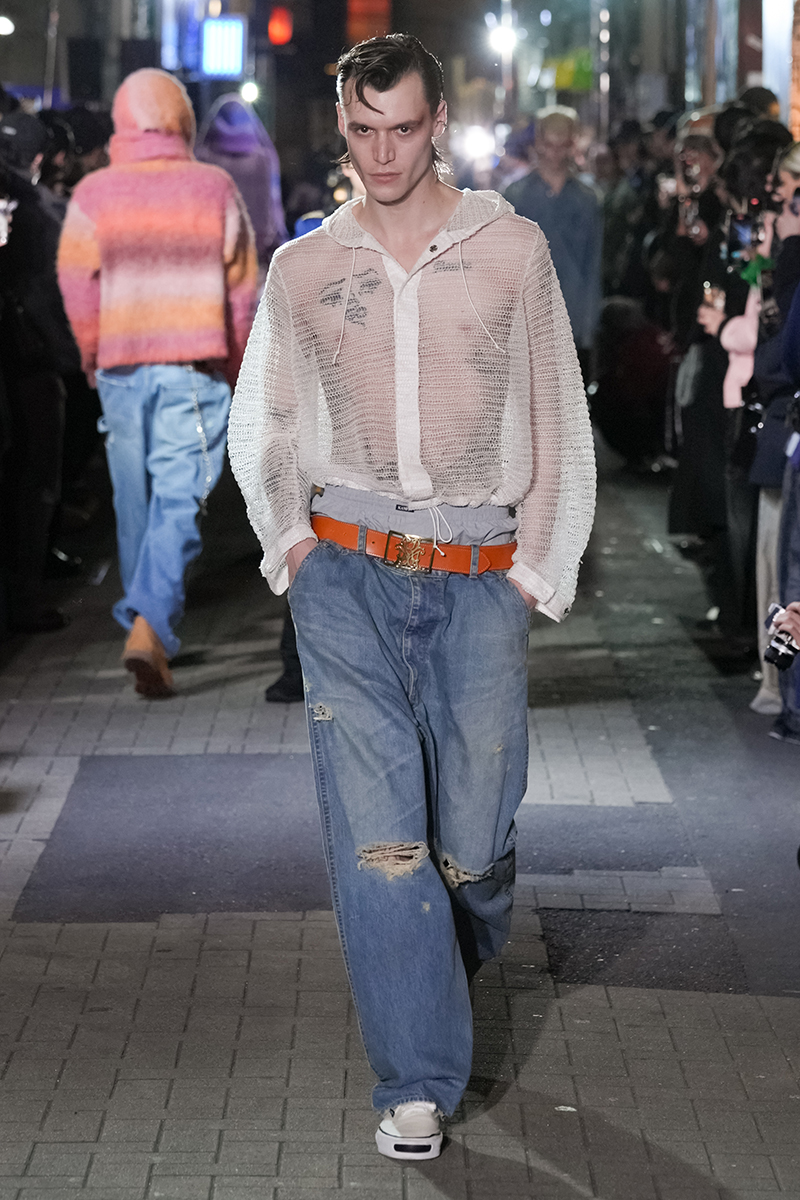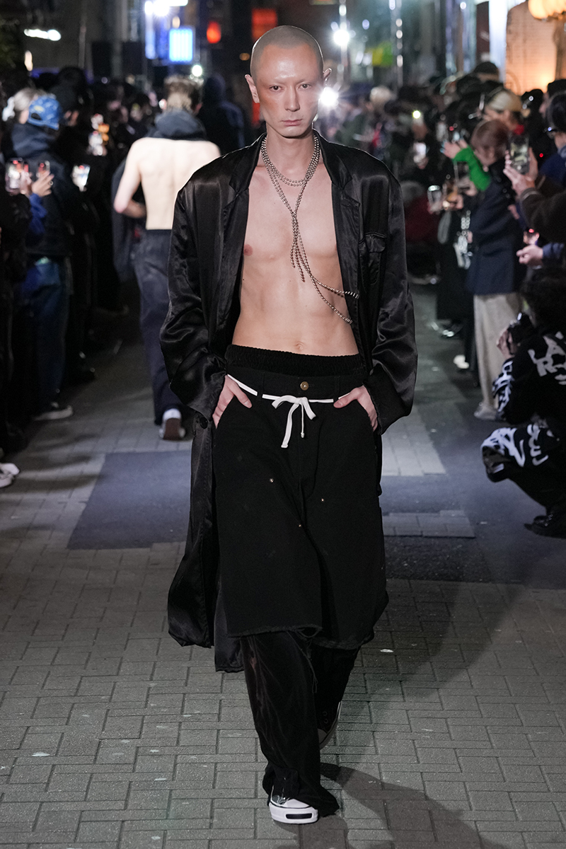ジェンダーニュートラルなスタンスは、メンズのブランドでも顕著だ。今シーズンの楽天 ファッション ウィーク 東京(以下、RFWT)のオープニングを務めた「エムエーエスユー(MASU)」のように、昨今はメンズブランドにおいても「良いものは良い。そこにメンズ・ウィメンズや、男性的・女性的という二元論は存在しない」というアティチュードが顕著だ。RFWTにおける代表格は、「カミヤ(KAMIYA)」。渋谷の雑踏で発表した24-25年秋冬コレクションは、一見すると頬に傷を持つケンカっ早い男性の装いのようだが、チュールのように透ける素材のフーディや、ラメ混のチェックのセットアップ、ラップスカートなど、二元論なら「女性的」な素材やアイテムを自然に差し込む。デニムを基軸とする「タナカ(TANAKA)」、男女の違いが少ない制服に着想源を得た「ケイスケヨシダ(KEISUKEYOSHIDA)」などは結果、「カミヤ」以上にジェンダーレスだ。