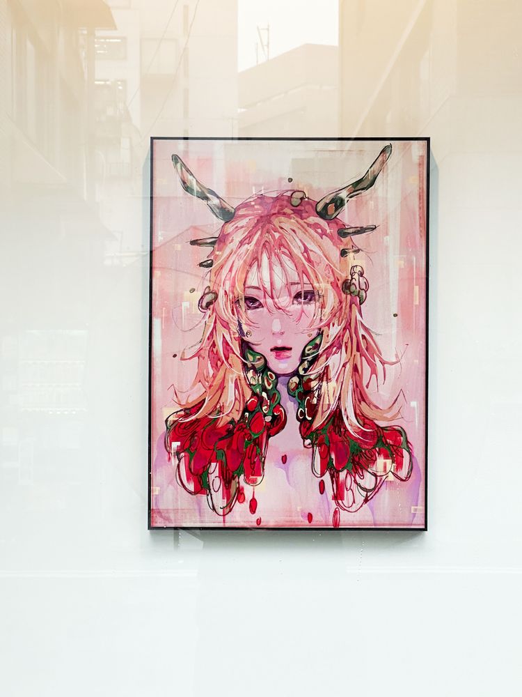 油絵作品に関しては、キービジュアルのデジタルの作品と呼応していて、この赤い絵はキービジュアルの女の子を油絵で描いています。人間なのか人間じゃないのか分からない人体に囲まれた女の子。両隣の2作品は、普段は見えない内臓の部分だったり、膿みたいなものがどろどろとあふれ出してしまっている女の子をテーマに描いています。