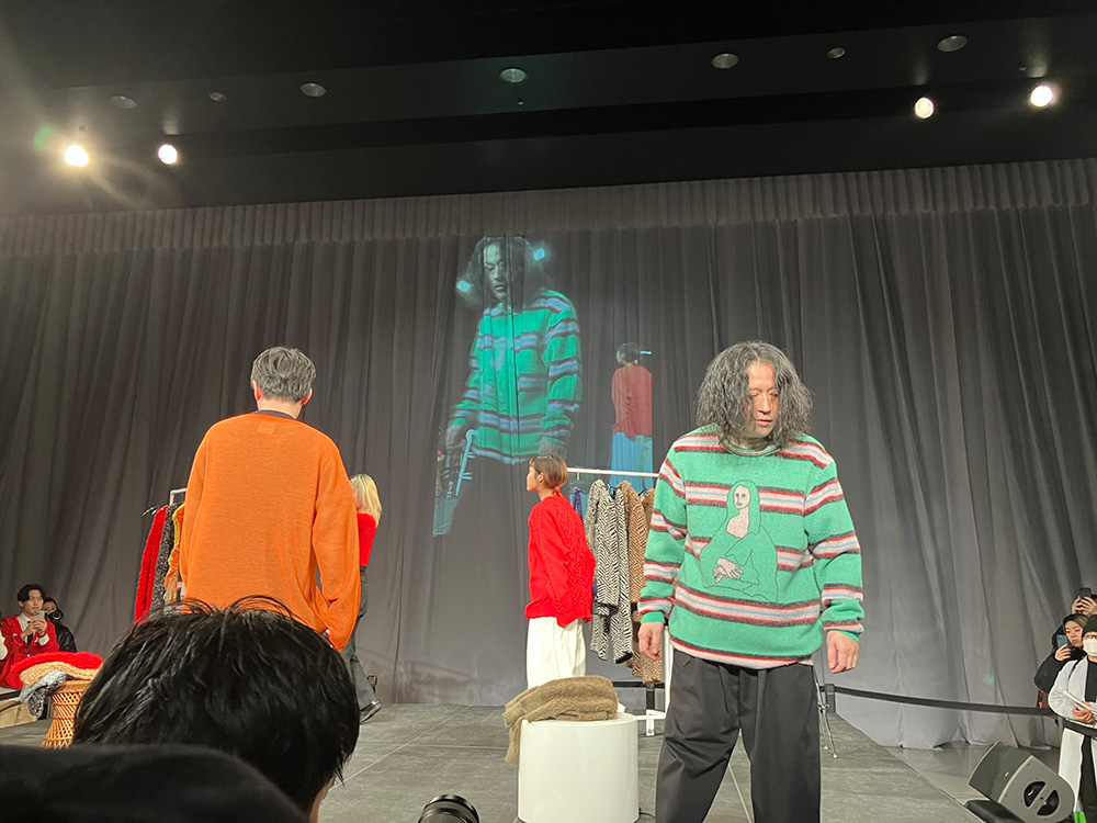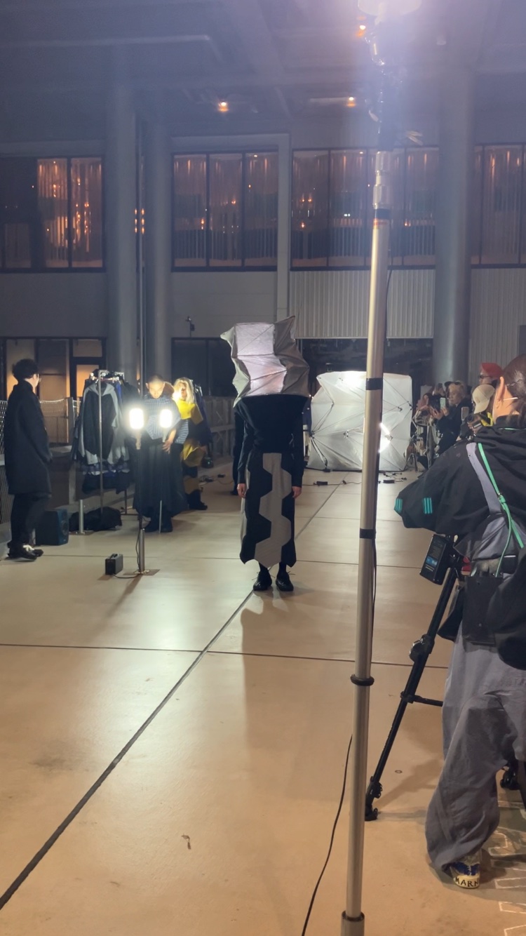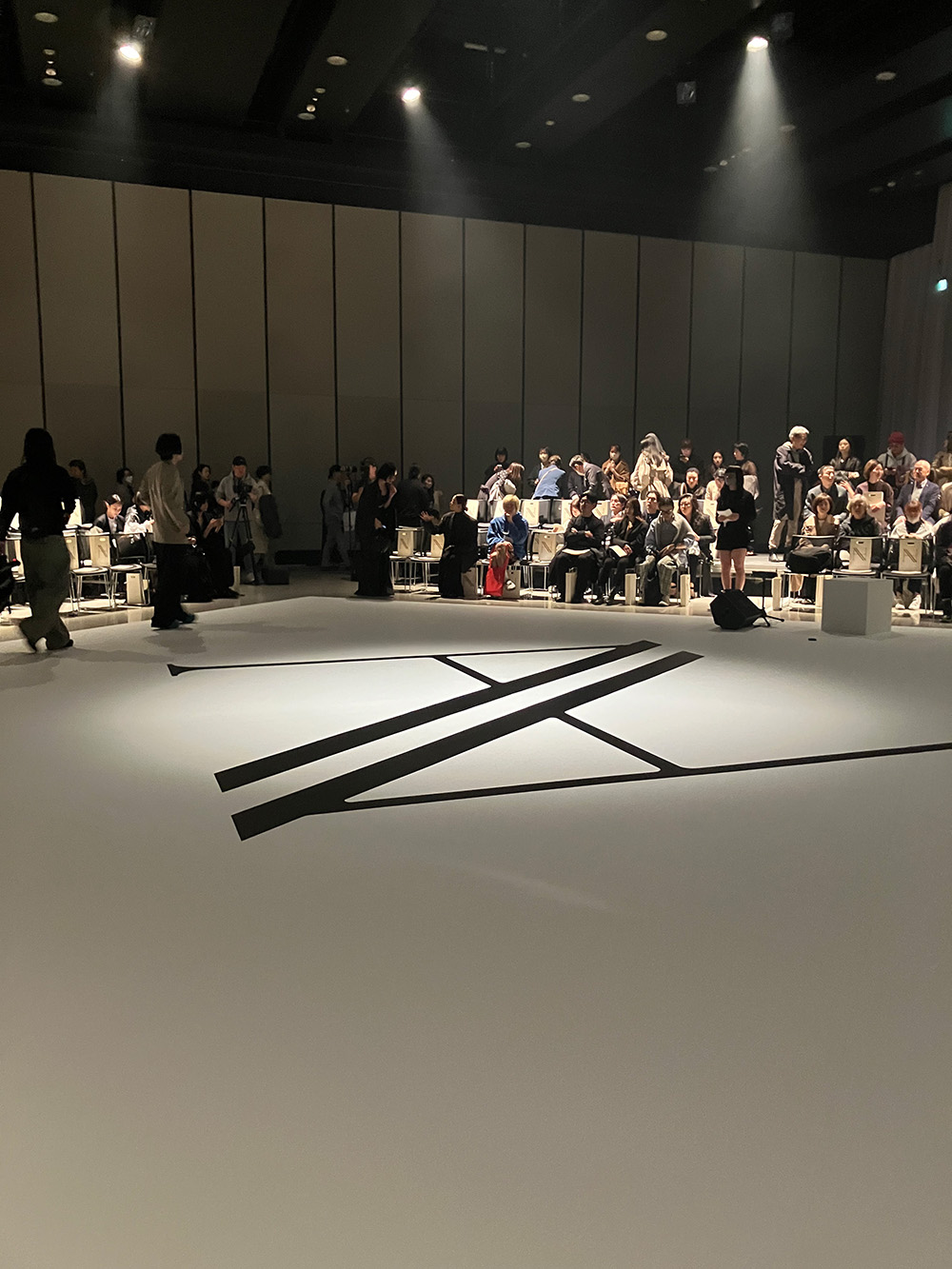 「タナカダイスケ(TANAKADAISUKE)」の夢のような世界観に浸ったのもつかの間、運転手さんとうまく落ち合えず、「『ヨウヘイ オオノ(YOHEI OHNO)』に間に合わない!」とアワアワ。そこへスタイリストのコギソマナさんから「私の車、乗る?」と救いの手が。運転席の限られたスペースで、ブランドに合わせた服に爆速で着替えるマナさんを見て「さすが業界人」と感嘆。会場では金屏風の前を歩くモデルを凝視しつつ、必死にメモを取っていると、空間を包む芳香に気づく。おみやげに同様の香り玉をもらえてうれしい。次の「フェティコ(FETICO)」に到着すると、バックステージでカメラマンが撮影準備中。「ショーはみんなで作るもの」と気が引き締まる。