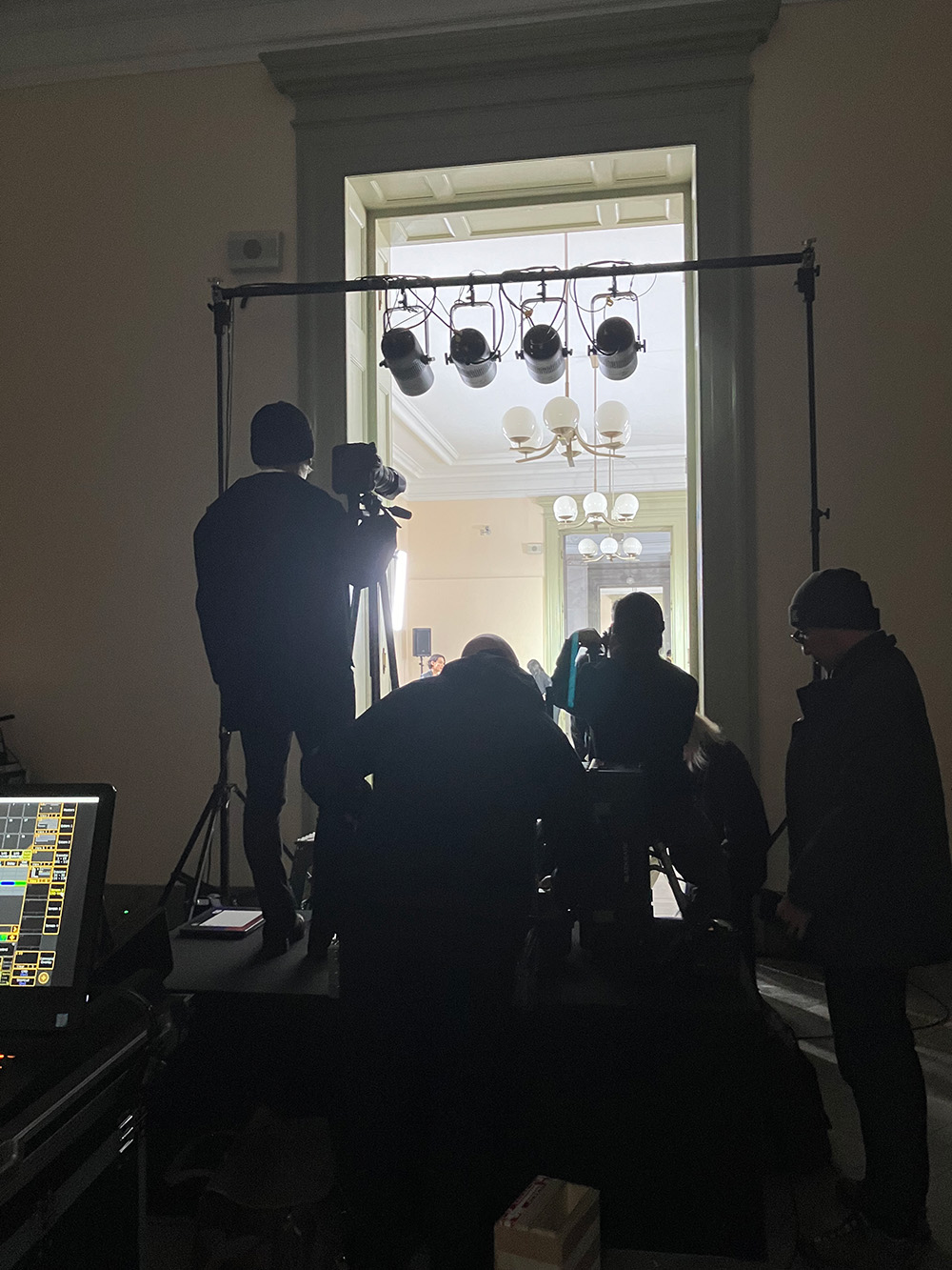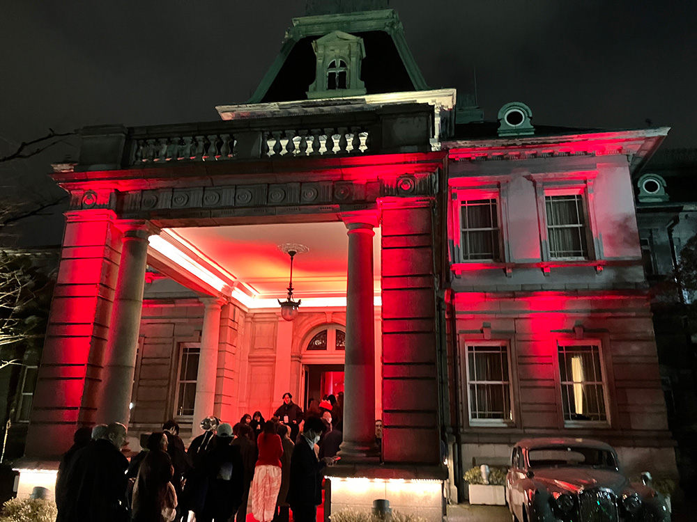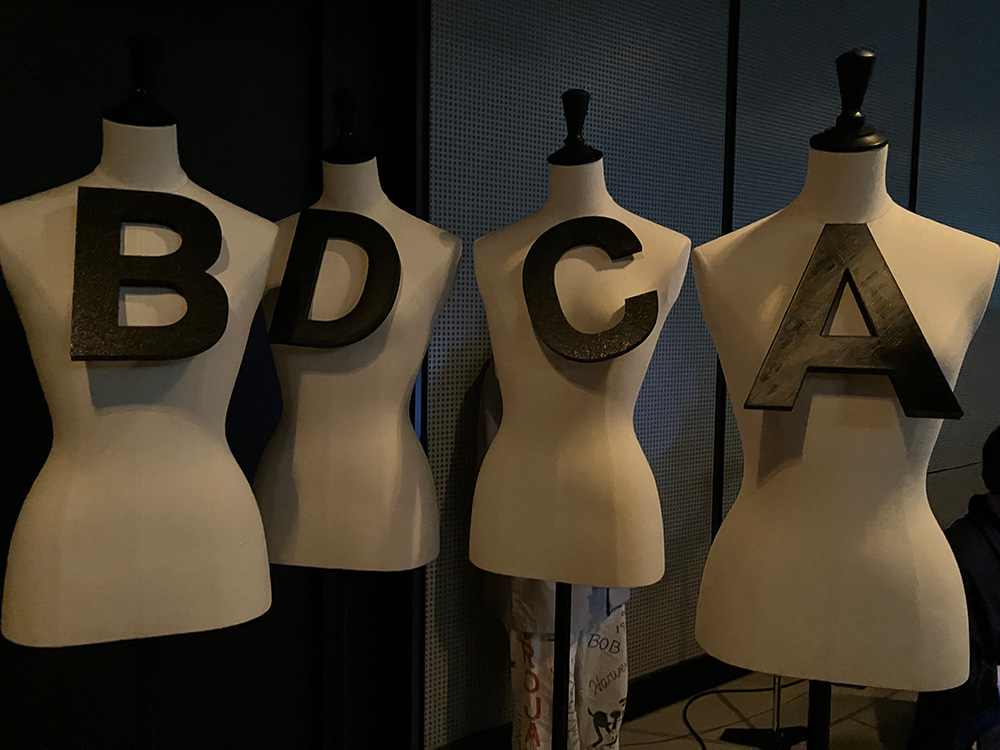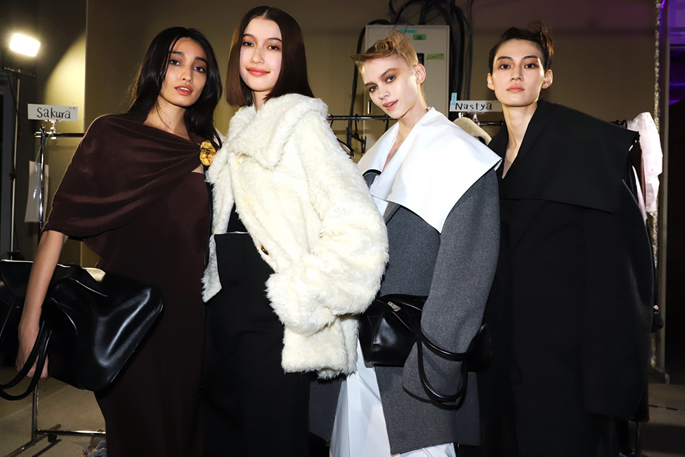 「タナカダイスケ(TANAKADAISUKE)」の夢のような世界観に浸ったのもつかの間、運転手さんとうまく落ち合えず、「『ヨウヘイ オオノ(YOHEI OHNO)』に間に合わない!」とアワアワ。そこへスタイリストのコギソマナさんから「私の車、乗る?」と救いの手が。運転席の限られたスペースで、ブランドに合わせた服に爆速で着替えるマナさんを見て「さすが業界人」と感嘆。会場では金屏風の前を歩くモデルを凝視しつつ、必死にメモを取っていると、空間を包む芳香に気づく。おみやげに同様の香り玉をもらえてうれしい。次の「フェティコ(FETICO)」に到着すると、バックステージでカメラマンが撮影準備中。「ショーはみんなで作るもの」と気が引き締まる。