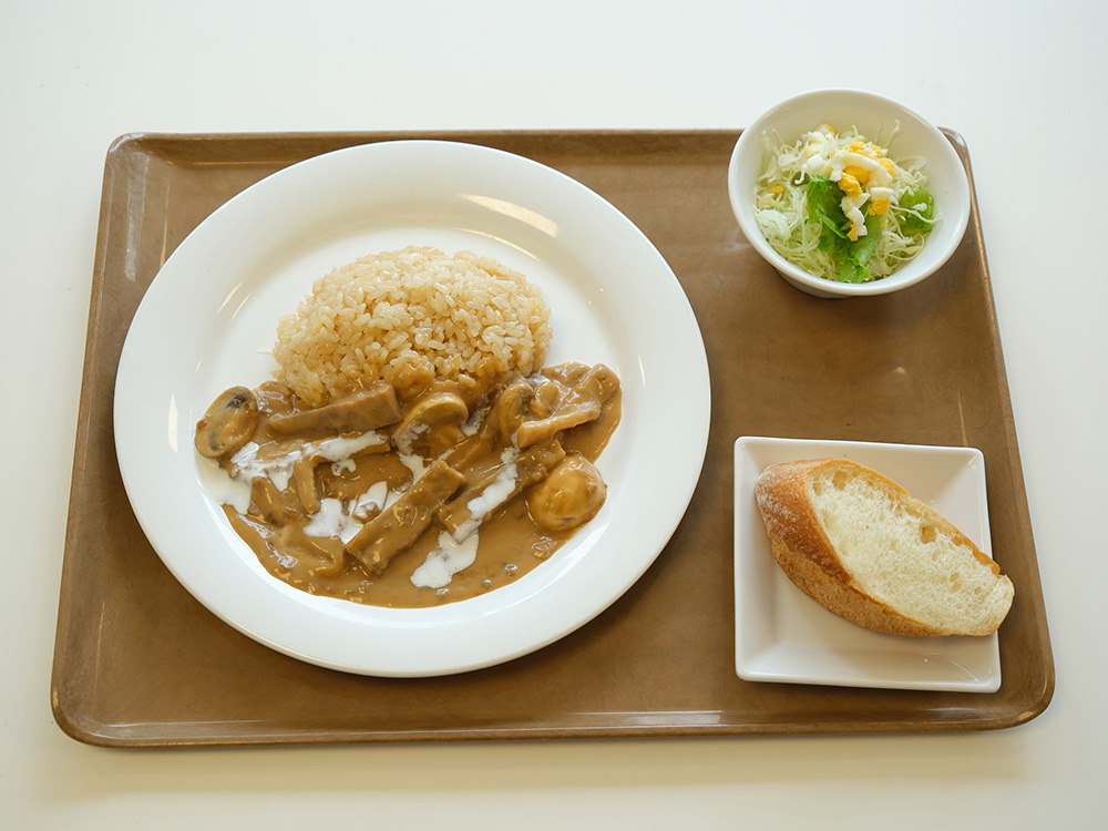 今日は「三元豚のメンチカツデミグラスソース」を選びました。不定期に登場するメンチカツは、お肉がとってもジューシーなんです。「厚切りトンカツ」がメニューにあると「ラッキー!」とうれしくなりますね(笑)。デパ地下で働いているので食には詳しいと自負していますが、ここの社食は毎日ホントに楽しみ。出口には明日のメニューが貼り出されていますが、「明日はこれを食べよう」とワクワクしながら職場に戻ります。