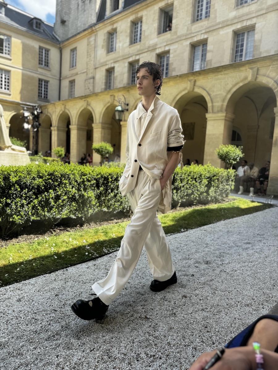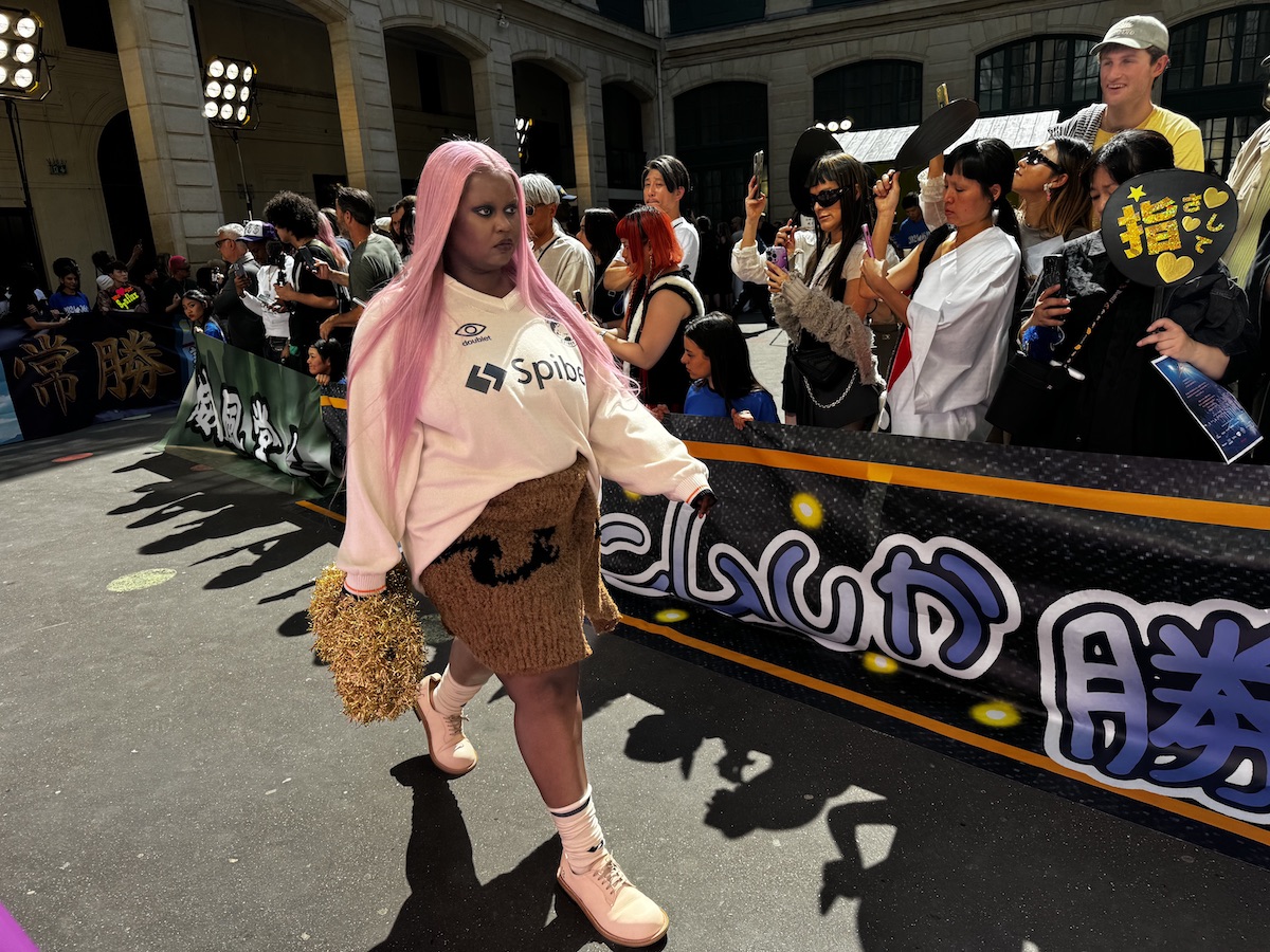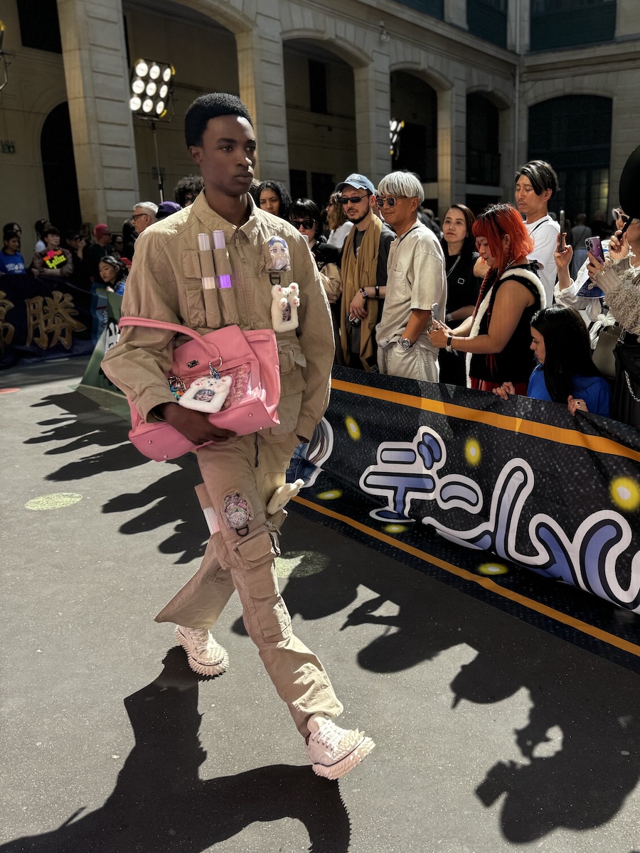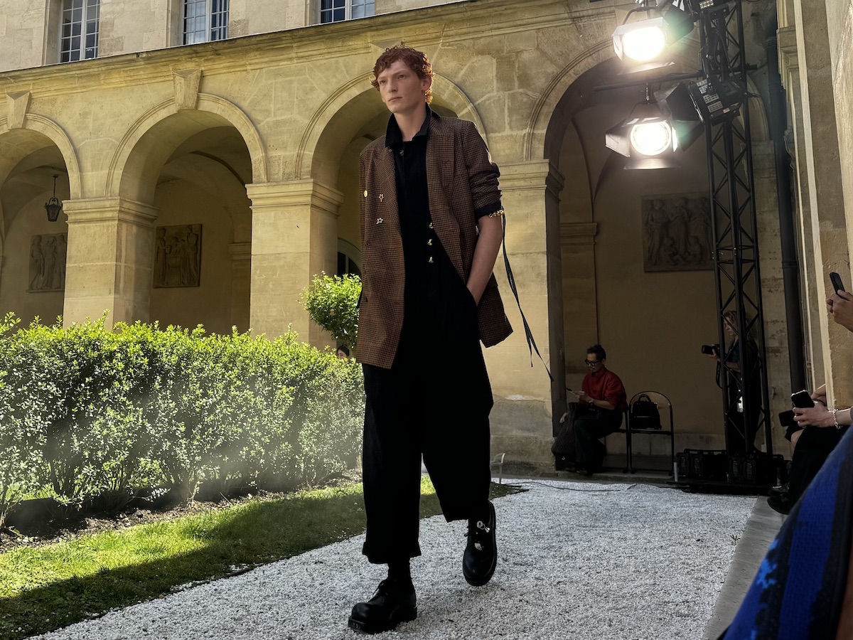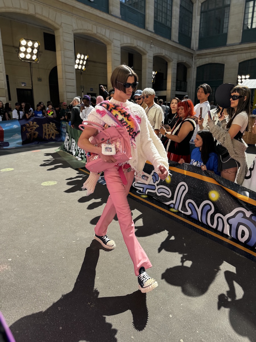 最終日は、「サカイ(SACAI)」のショーでスタートです。阿部千登勢デザイナーは国際的なアーティストや音楽関係者とも関係が深いため、ショー会場にはセレブリティーが多く駆けつけます。公式スケジュールの朝一のショーが遅れると、その後に続く全てのブランドに影響し、ショー開始時間が大きく乱れます。パリ・メンズ2日目「プロトタイプス(PROTOTYPES)」の、遅刻王イェ(Ye)到着待ちでの84分遅れがトラウマとなり、「サカイ」でもショーの待ち時間はヒヤヒヤしていました。パリはオリンピック開催間近とあって、通行止めと大渋滞により、ただでさえ移動が大変です。最終日の疲れ切った体にムチ打って、他会場まで全力疾走する気力も体力もほとんどありません。「セレブさん、どうか遅れずに来てください」という願いが通じたのか、ファレル・ウィリアムス(Pharrell Williams)やセリーナ・ウィリアムズ(Serena Williams)といった大物ゲストは遅れることなく着席。おかげで、パリコレでは許容範囲の30分遅れで開幕し、ショーを落ち着いて鑑賞できました。