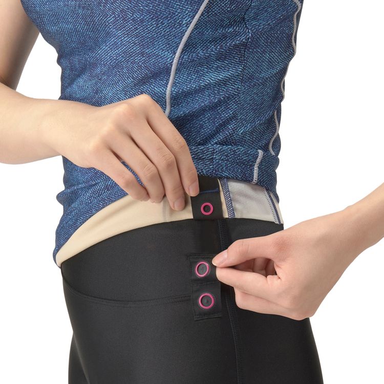 パンツはハイウエストなデザインで、「気になるおなか周りもカバー」。さらに、水中でトップスがめくり上がらないように、トップスとパンツを留めるスナップボタンを備える。