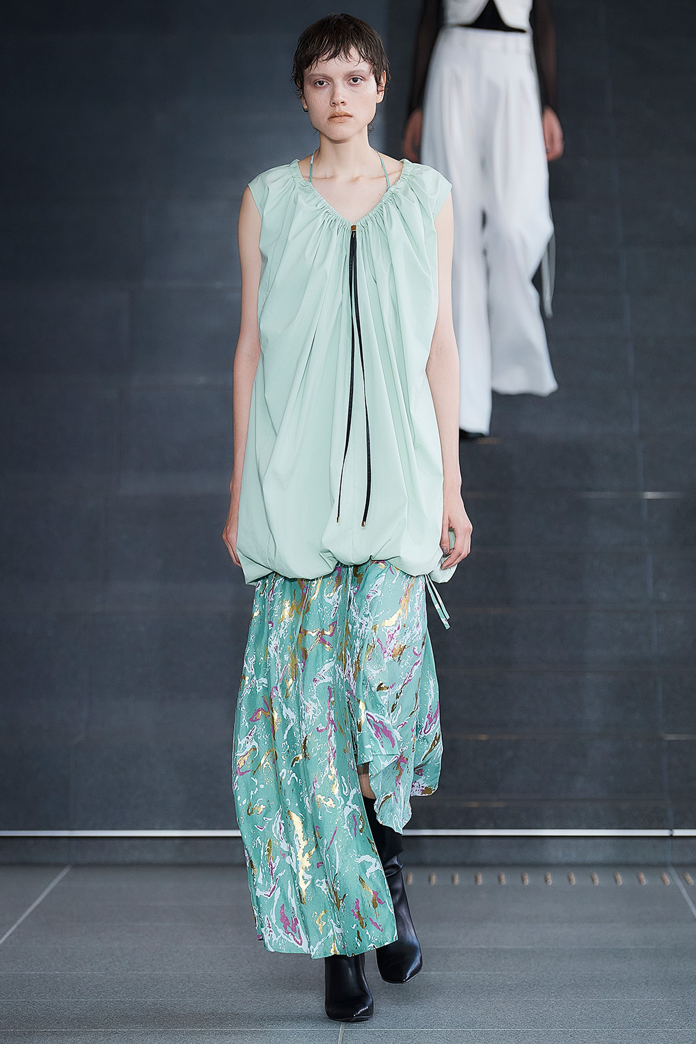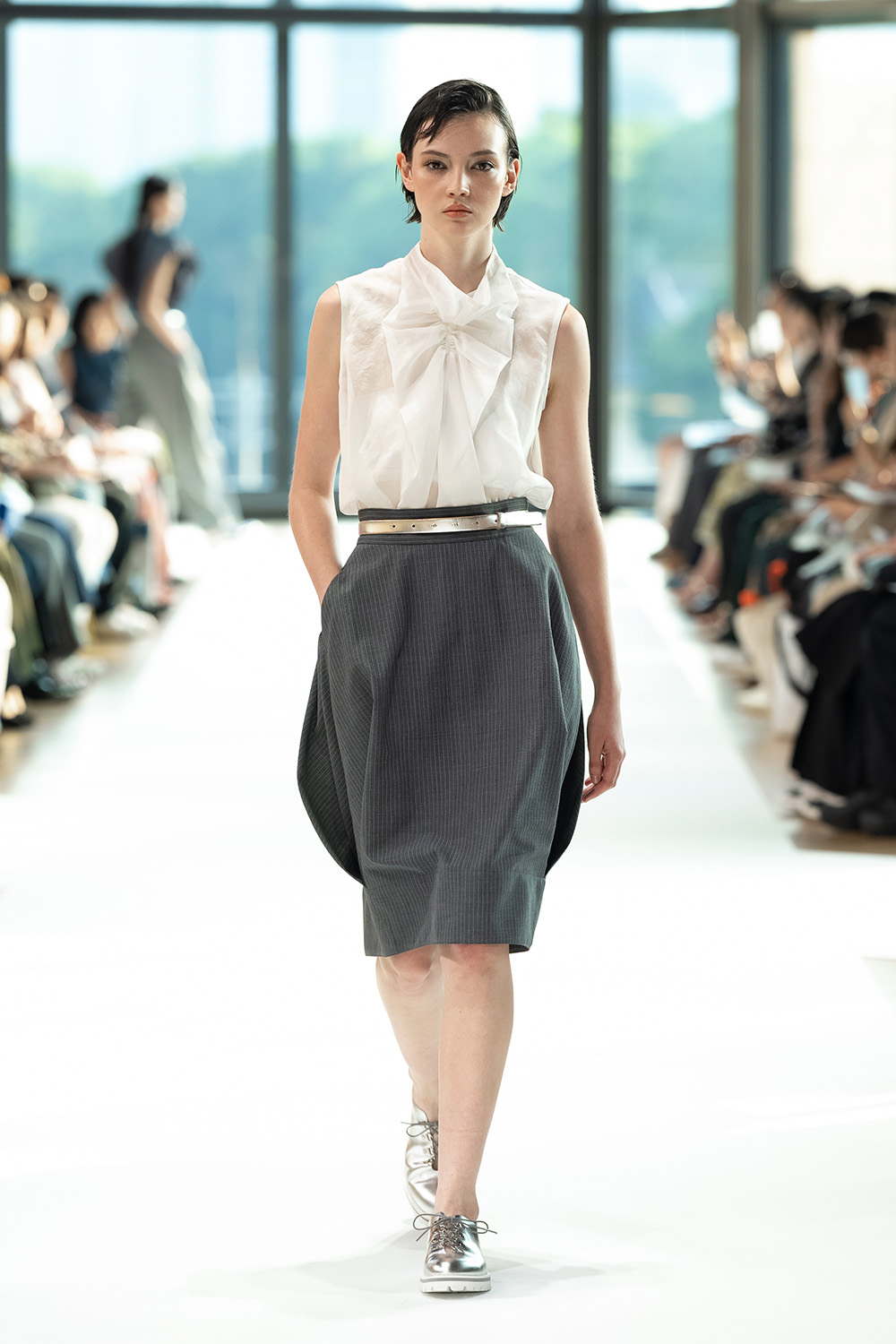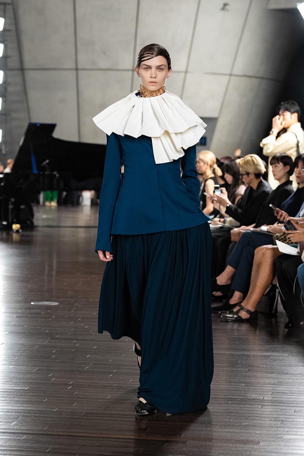 東コレ前に独自でショーを開催し、よりエレガンスに振り切った鋭いスタイルを披露。銀箔を硫化させた焼箔加工の数点以外は全て無地に徹し、素材感の美しさを強調する。柄を排した分、アシンメトリーなコクーンやオーバーサイズ、ドレープ、大きなスリットなど、フォームのバリエーションは多彩にそろえた。彫刻家コンスタンティン・ブランクーシ(Constantin Brancusi)の思想と、デザイナーの美学との接点を探りながら、身にまとうラグジュアリーを提唱する。
