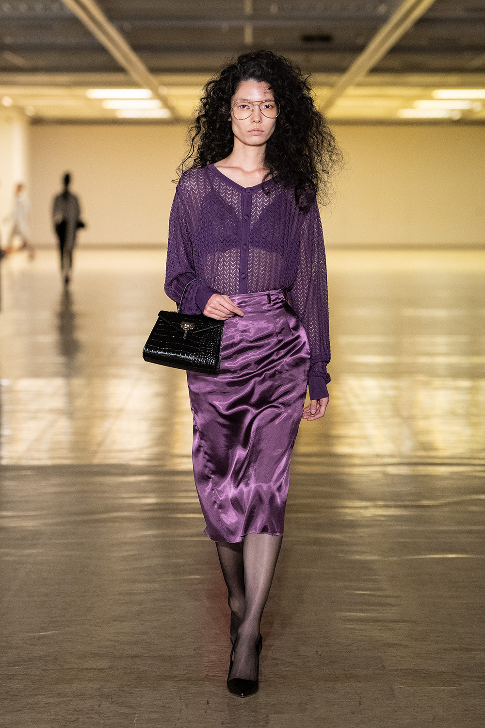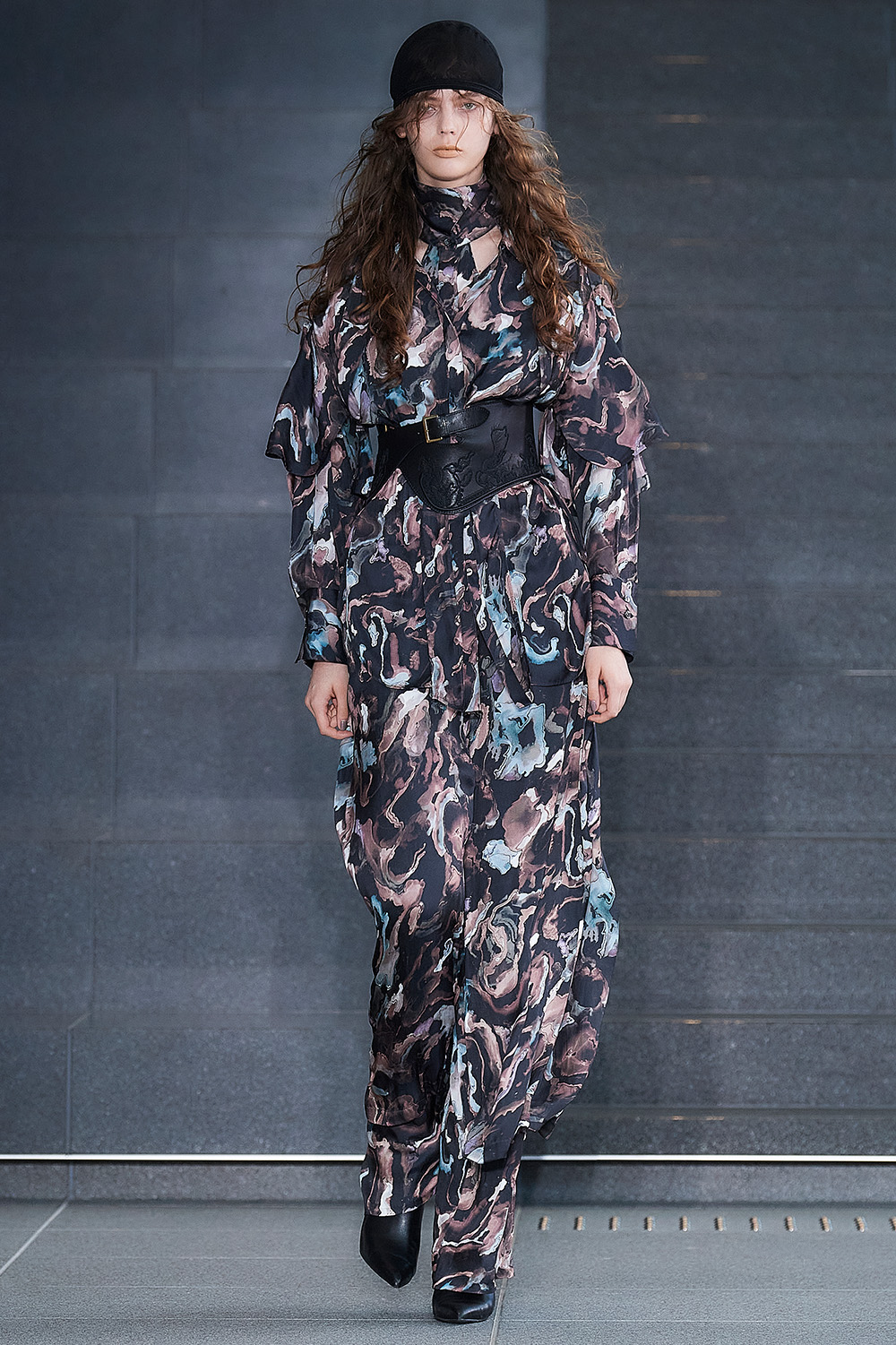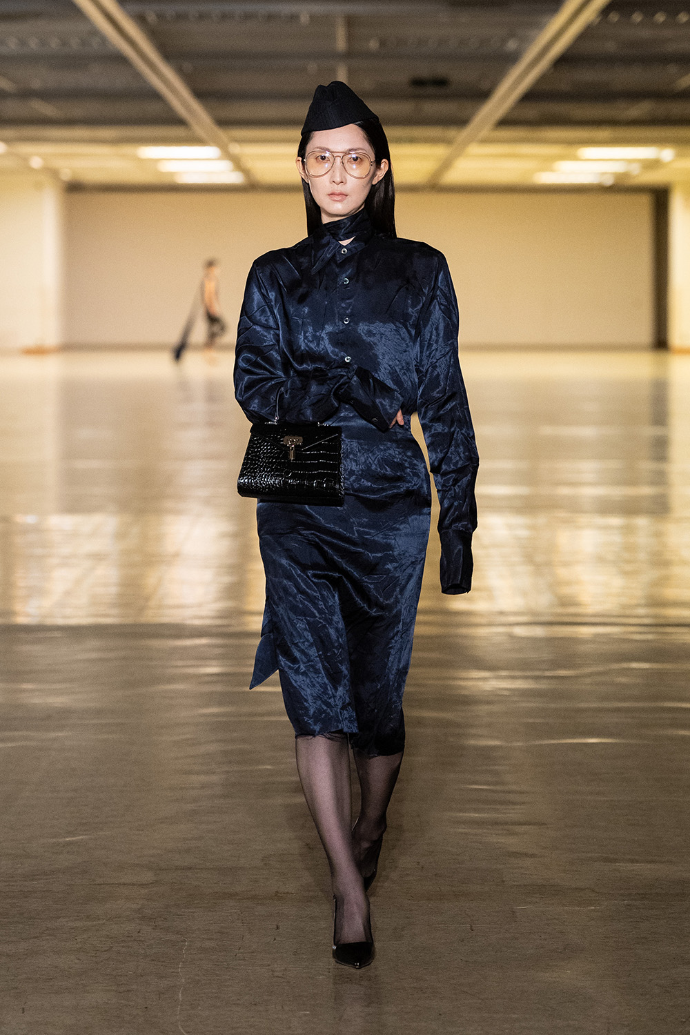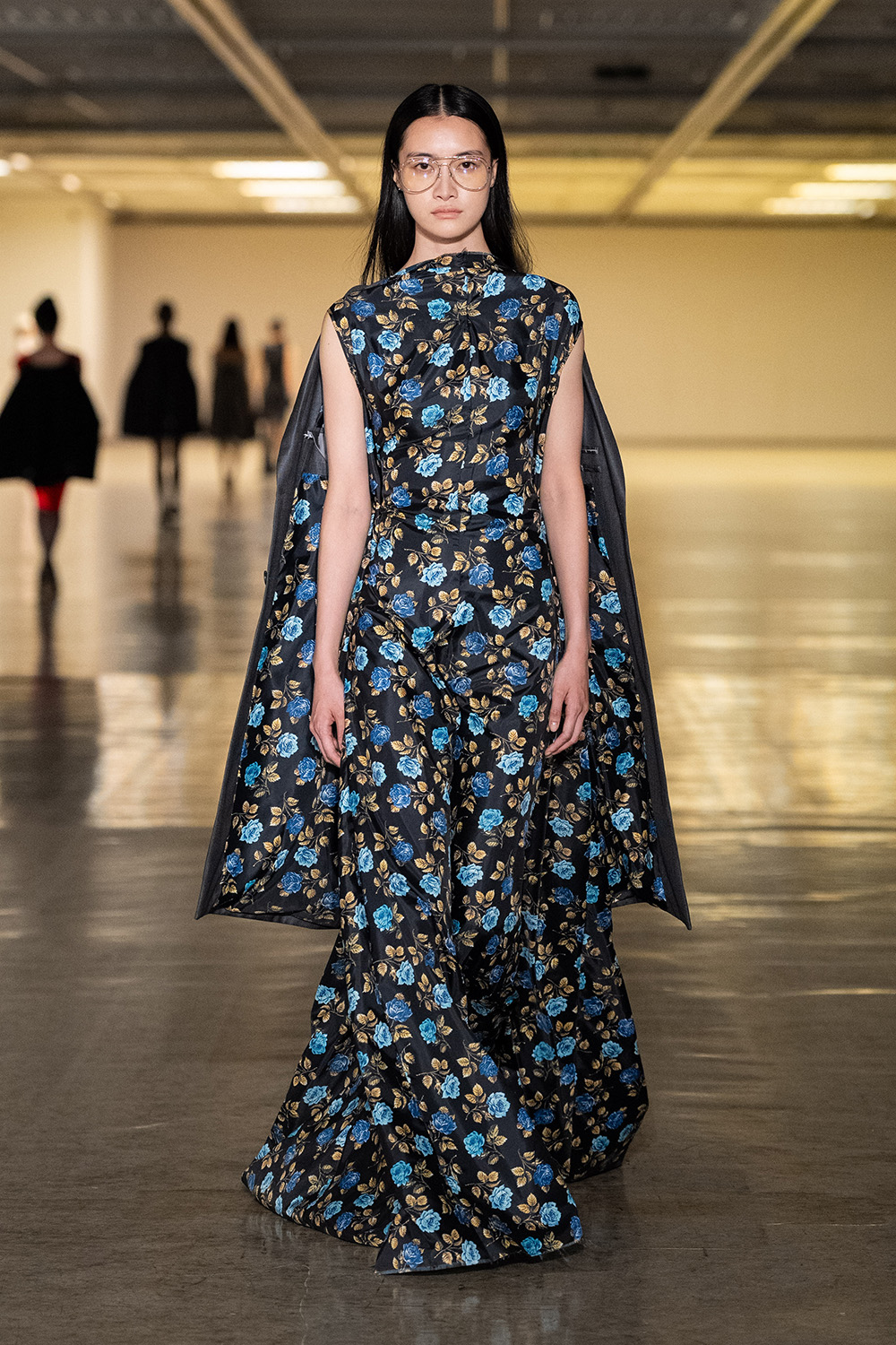 東コレ前に独自でショーを開催し、よりエレガンスに振り切った鋭いスタイルを披露。銀箔を硫化させた焼箔加工の数点以外は全て無地に徹し、素材感の美しさを強調する。柄を排した分、アシンメトリーなコクーンやオーバーサイズ、ドレープ、大きなスリットなど、フォームのバリエーションは多彩にそろえた。彫刻家コンスタンティン・ブランクーシ(Constantin Brancusi)の思想と、デザイナーの美学との接点を探りながら、身にまとうラグジュアリーを提唱する。