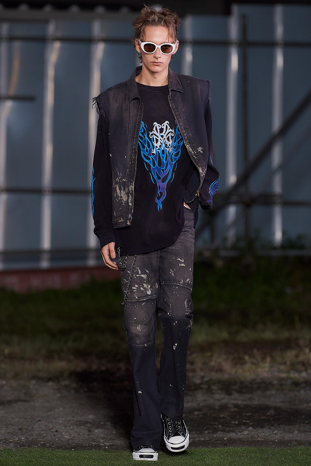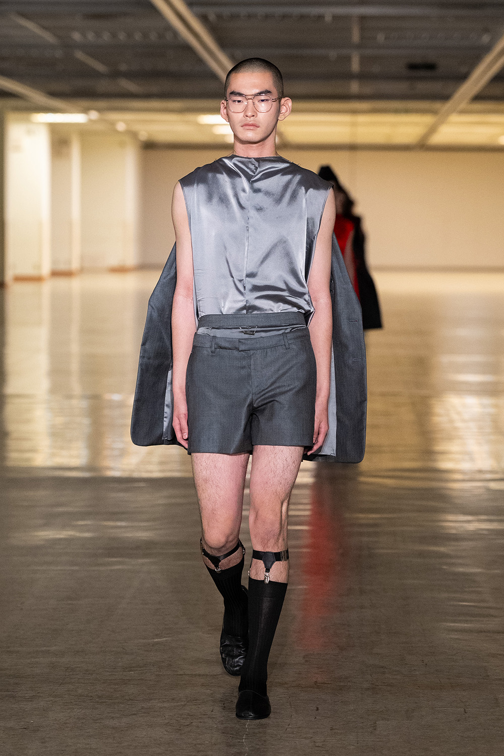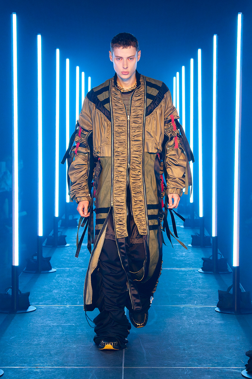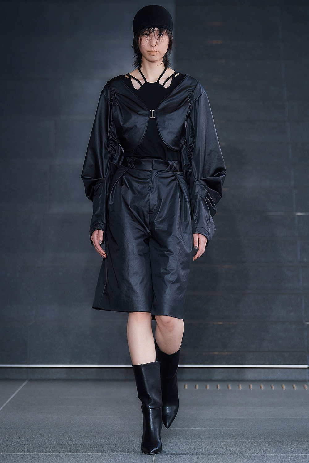 市川マーカス知利デザイナーが4月に始動した新ブランド。デビューショーのテーマは“SMASH!!!!”で、デザイナーが日常で対峙する、さまざまな“激情”に着想を得て、「全ルック“一撃必殺”になるようなスタイル」を目指したという。メッシュなどの異素材を組み合わせたオーバーサイズブルゾンや、無数のひもが垂れ下がるボンバージャケットなど、インパクトあるルックが並び、ラフなストリート感ときれいで品のあるスタイルの融合を表現した。
