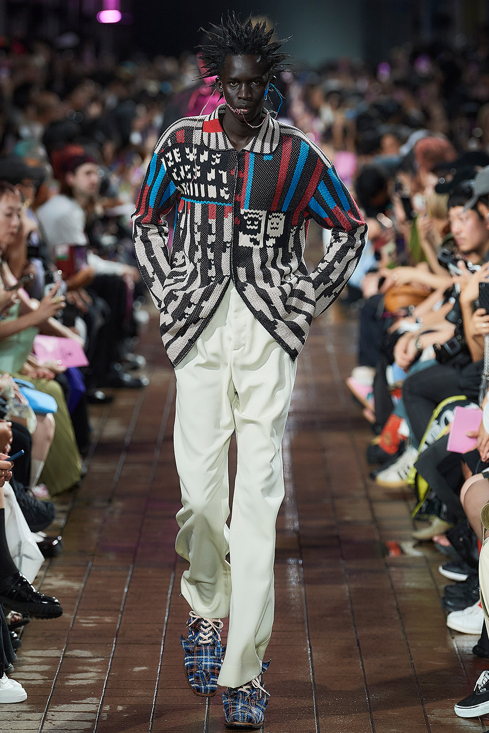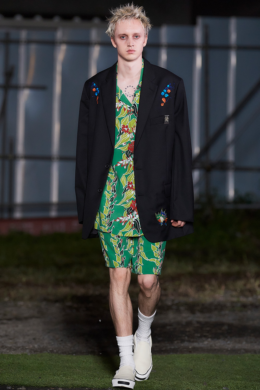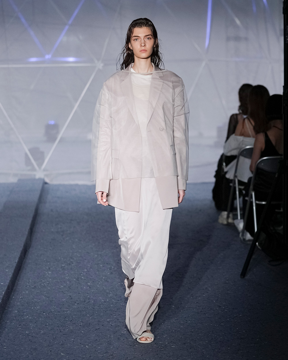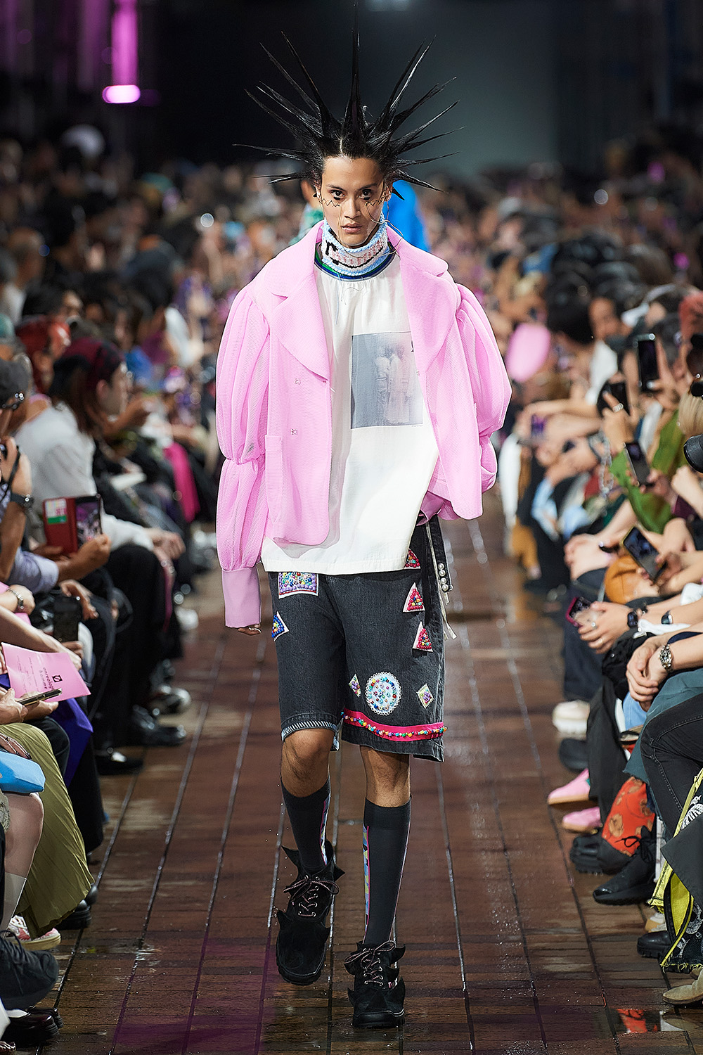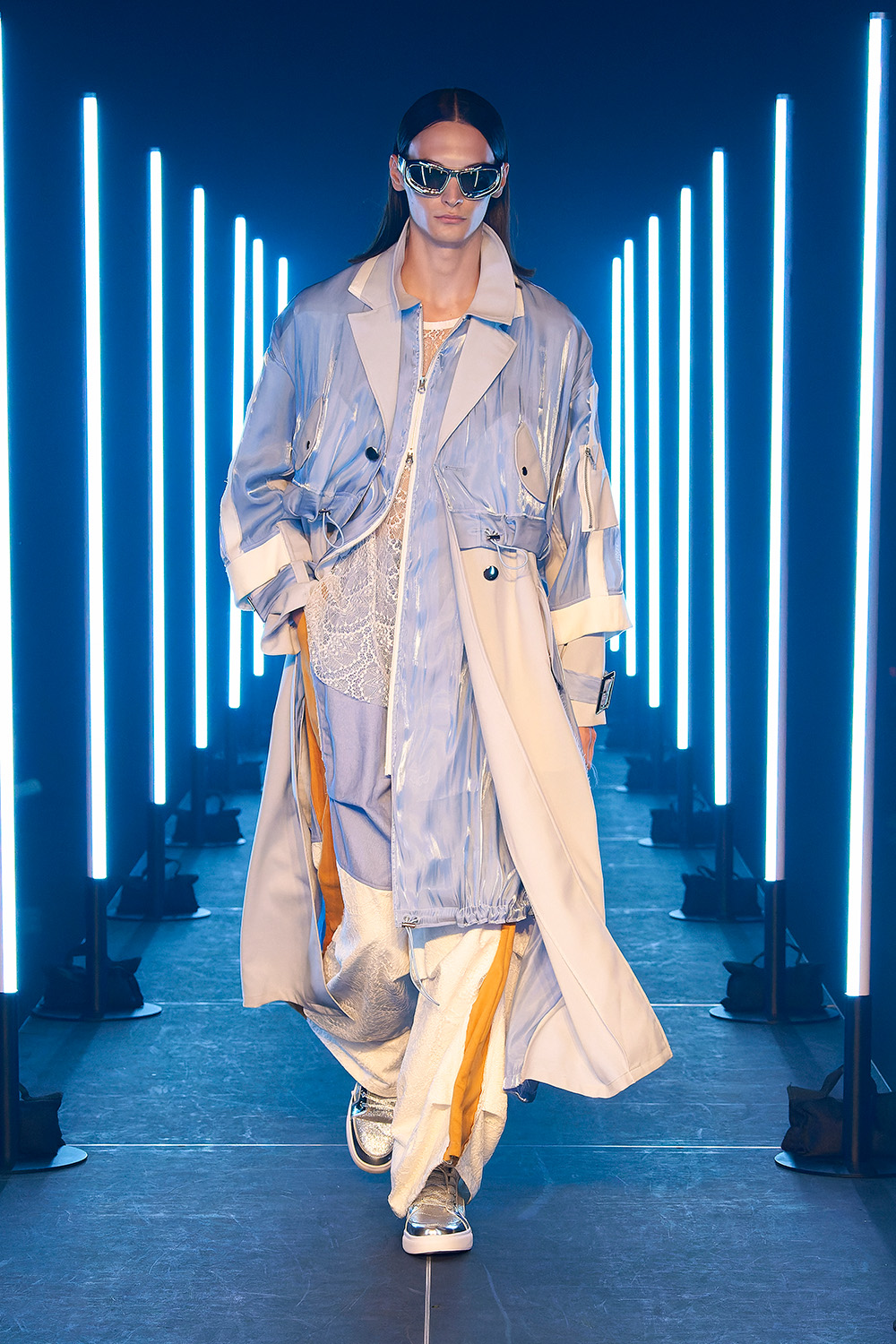 市川マーカス知利デザイナーが4月に始動した新ブランド。デビューショーのテーマは“SMASH!!!!”で、デザイナーが日常で対峙する、さまざまな“激情”に着想を得て、「全ルック“一撃必殺”になるようなスタイル」を目指したという。メッシュなどの異素材を組み合わせたオーバーサイズブルゾンや、無数のひもが垂れ下がるボンバージャケットなど、インパクトあるルックが並び、ラフなストリート感ときれいで品のあるスタイルの融合を表現した。