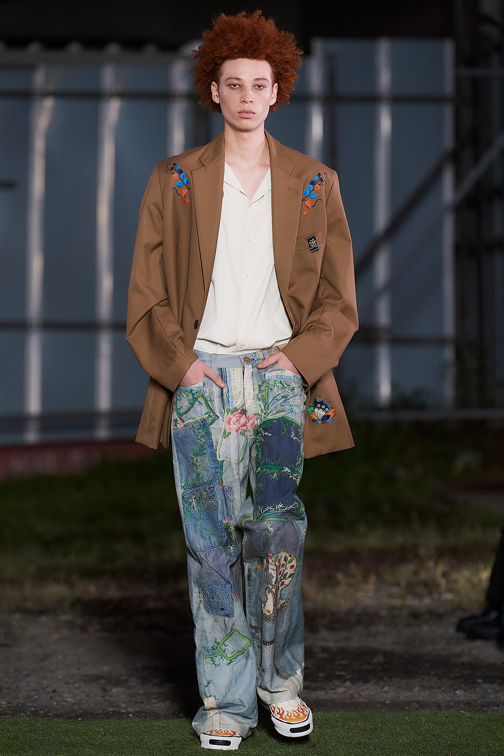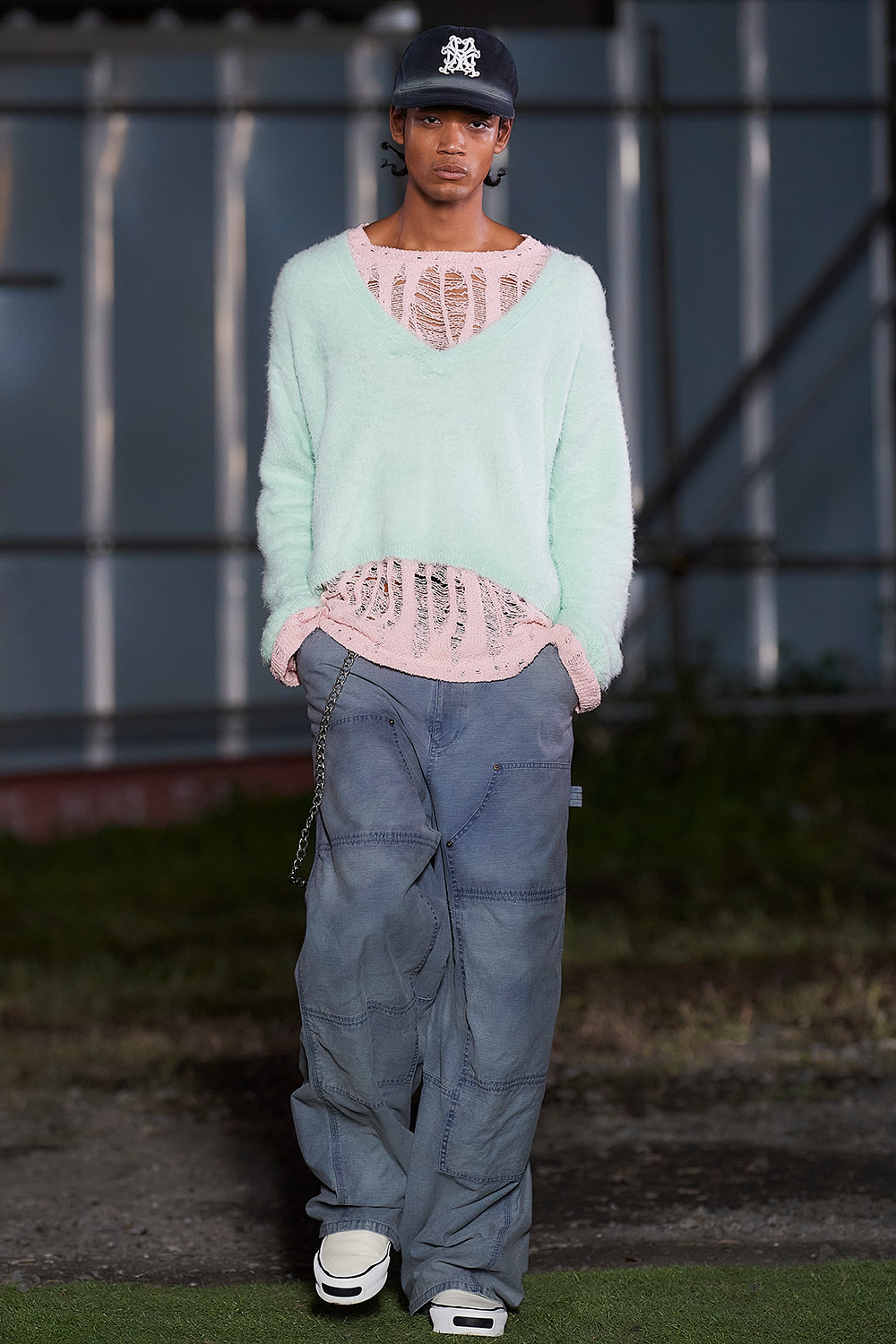 前身ブランドから「カミヤ」に改名後、神谷康司デザイナーの“男らしさ”の濃度が高まる。今季は自身が考える“憧れの男”を探求し、未熟な少年の自由さをストリートウエアに投影した。得意の加工デニムはバリエーションを増やし、オーバーダイの色味やトロンプルイユのユーモアで軽やかに。売れ筋のニットはダメージ加工でグランジ風に、スニーカーはファイヤーパターンでバイカー風に、さらにスケーターやラッパーなどあらゆるカルチャーをDJのようにごった煮ミックス。それでも軸がブレないのは、デザイナー自身の感覚を投影できている証拠だろう。