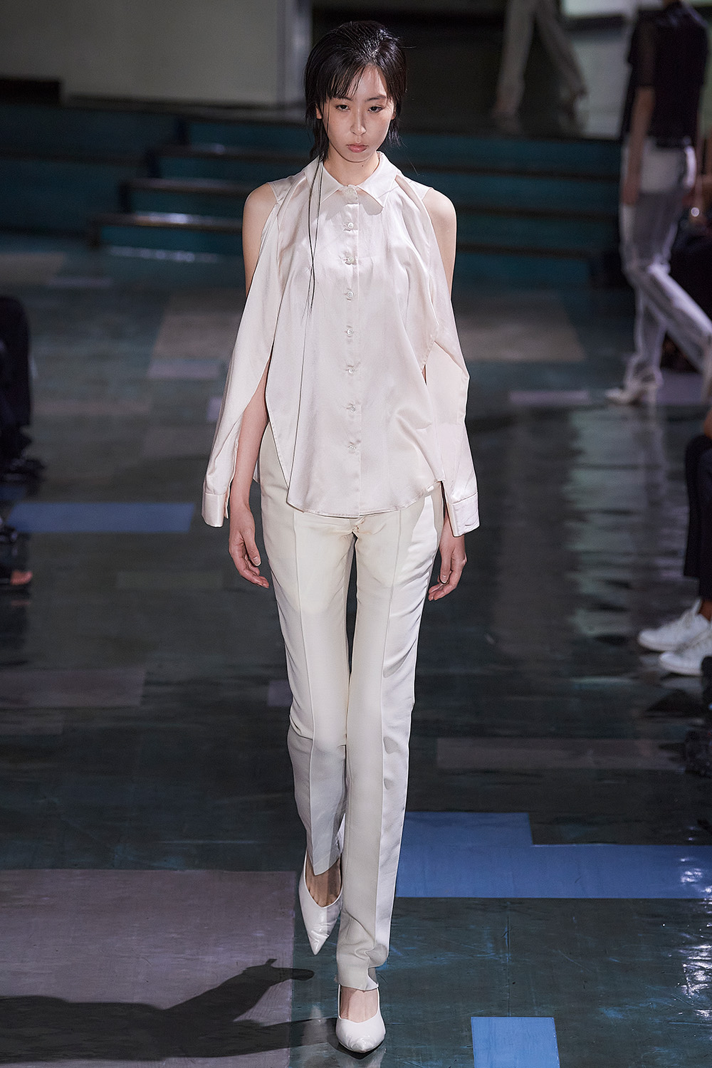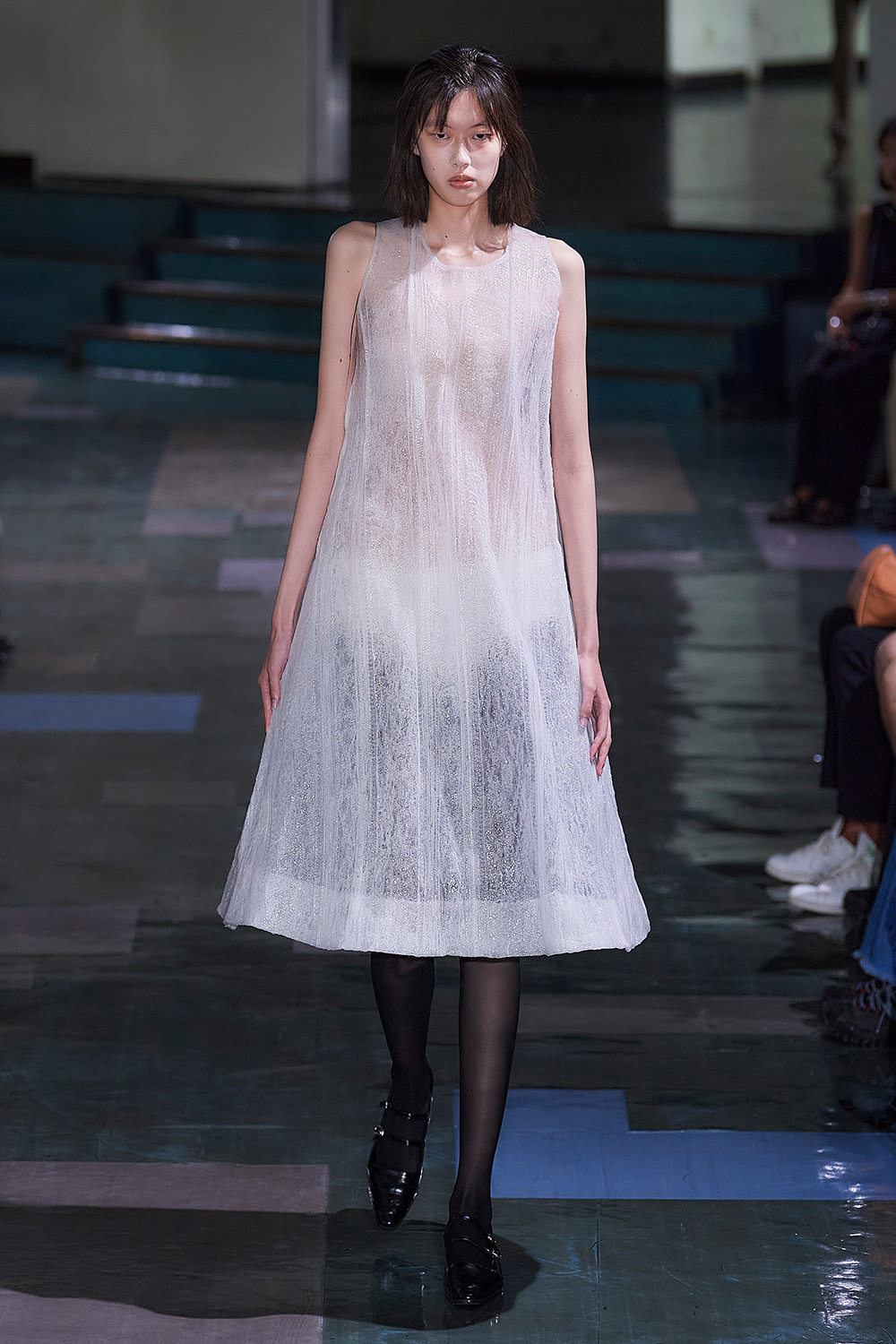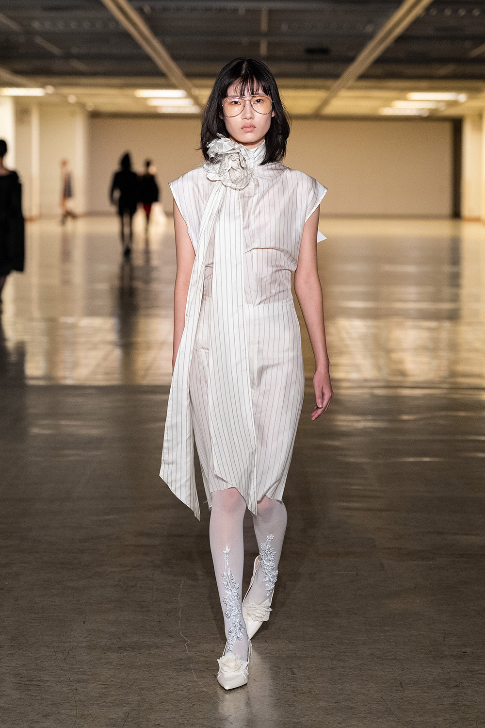 村上亮太デザイナーの幼少期の経験を元に、内向的な人が、勇気を出して外出する様子を服で描いた。レースカーテンで内と外の境界線を引きながらも、外界との関係も断ちたくないという思いを表現したのは、編んだレースを樹脂コーティングで固め、揺れるカーテンを閉じ込めたようなドレス。さらに、日常のささやかな場面をくっきりと折りじわがついたカーディガンや、「病院などの公共施設の色」をイメージしたカラーパレットに落とし込んだ。ハンドニット主体のクリエイションから変化し、春夏らしい薄手のニットトップスや、布帛のアイテムも加えた。