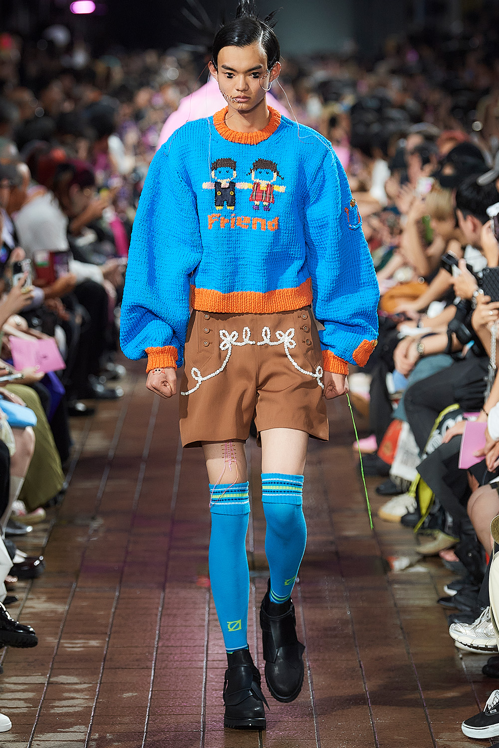 毎シーズン抽象的なテーマを設ける「ユェチ・チ」は、装飾性を持つ鍛鉄と機能的な鉄格子がモチーフ。デザイナーの手仕事への愛がにじみ出したように、全てのルックにビーズ刺しゅうをふんだんに施した。過剰な装飾が鍛鉄だとすれば、機能的なウエアは鉄格子だろう。「アグ(UGG)」や「アディダス(ADIDAS)」とのコラボアイテムはY2K感のあるスポーティーカジュアルで、“ギャルかわいい”ブランドの世界観を後押しした。
