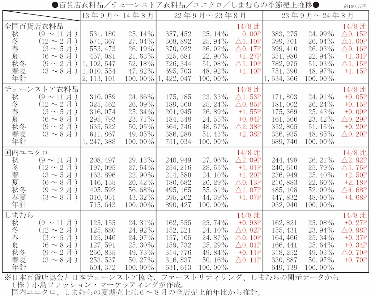 近年の温暖化で夏が暑く長くなって秋が短くなり暖冬が定着し、アパレル販売の秋冬と春夏の比重も変わったとされるが、実際のところはどうなのか。百貨店衣料品とチェーンストア衣料品、ユニクロとしまむらの季節売上構成比の変化を検証し、シーズンMDの再構築を探ってみた。
