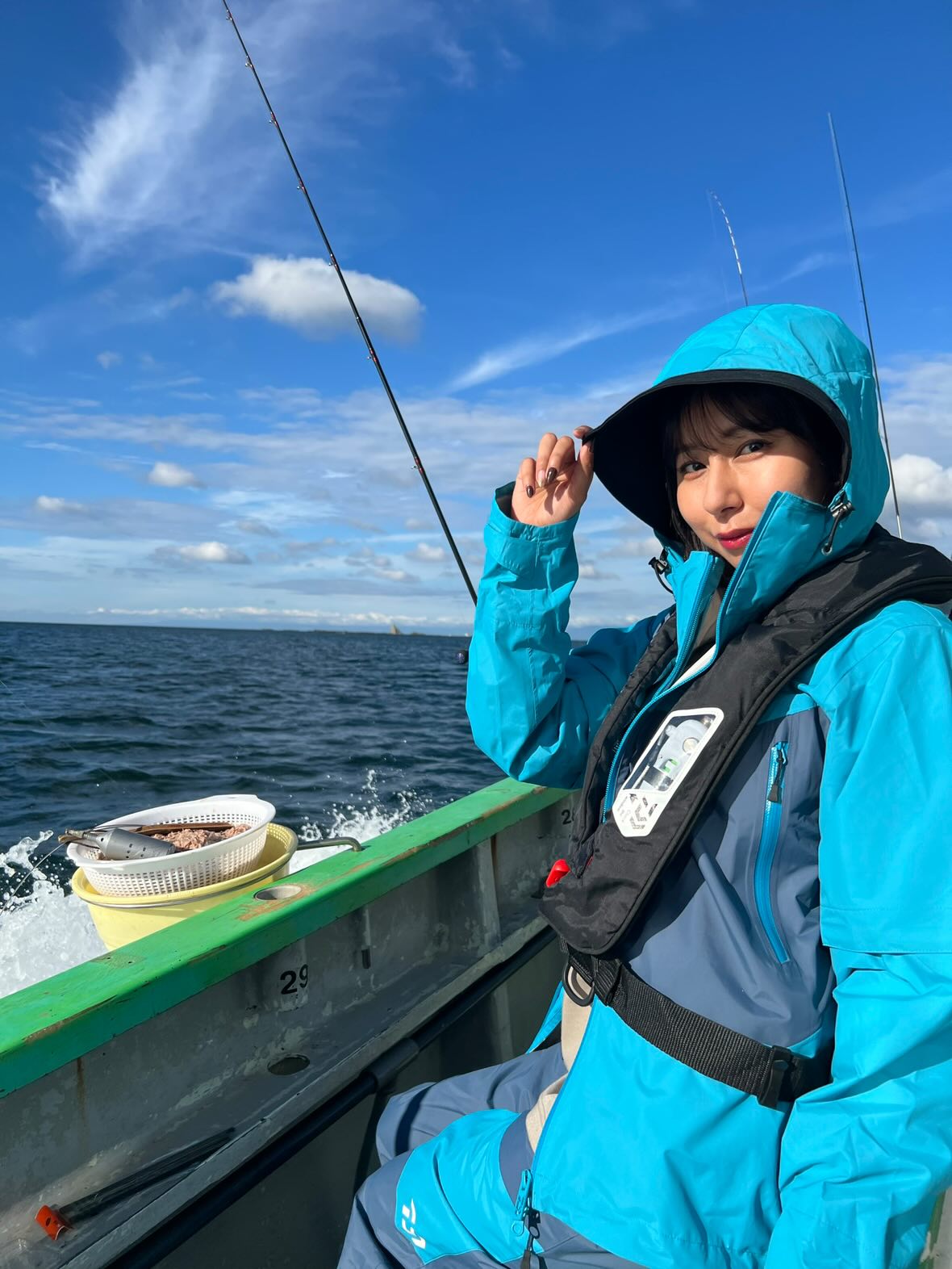 「2024年2月、『BYWU』の撮影のために荒れ狂った大分の海で、親友たちと釣りをしたときは最悪で最高でした(笑)。初めての船酔いで、降りたくても降りられず終わらない悪夢に絶望。そんな中、初めて感じるブリの引きの強さにアドレナリンが放出されたときは訳がわからなくなりました。1人じゃ太刀打ちできない重さの魚を、ギャル友と全力で引き上げた瞬間は絆を感じて最高でした。釣り上げたブリは、みんなで手分けしてさばいてお刺身にしたり料理したりしていただいたのですが、達成感と多幸感に包まれて船酔いのことなんて忘れるくらい最高地点で終わった思い出です」