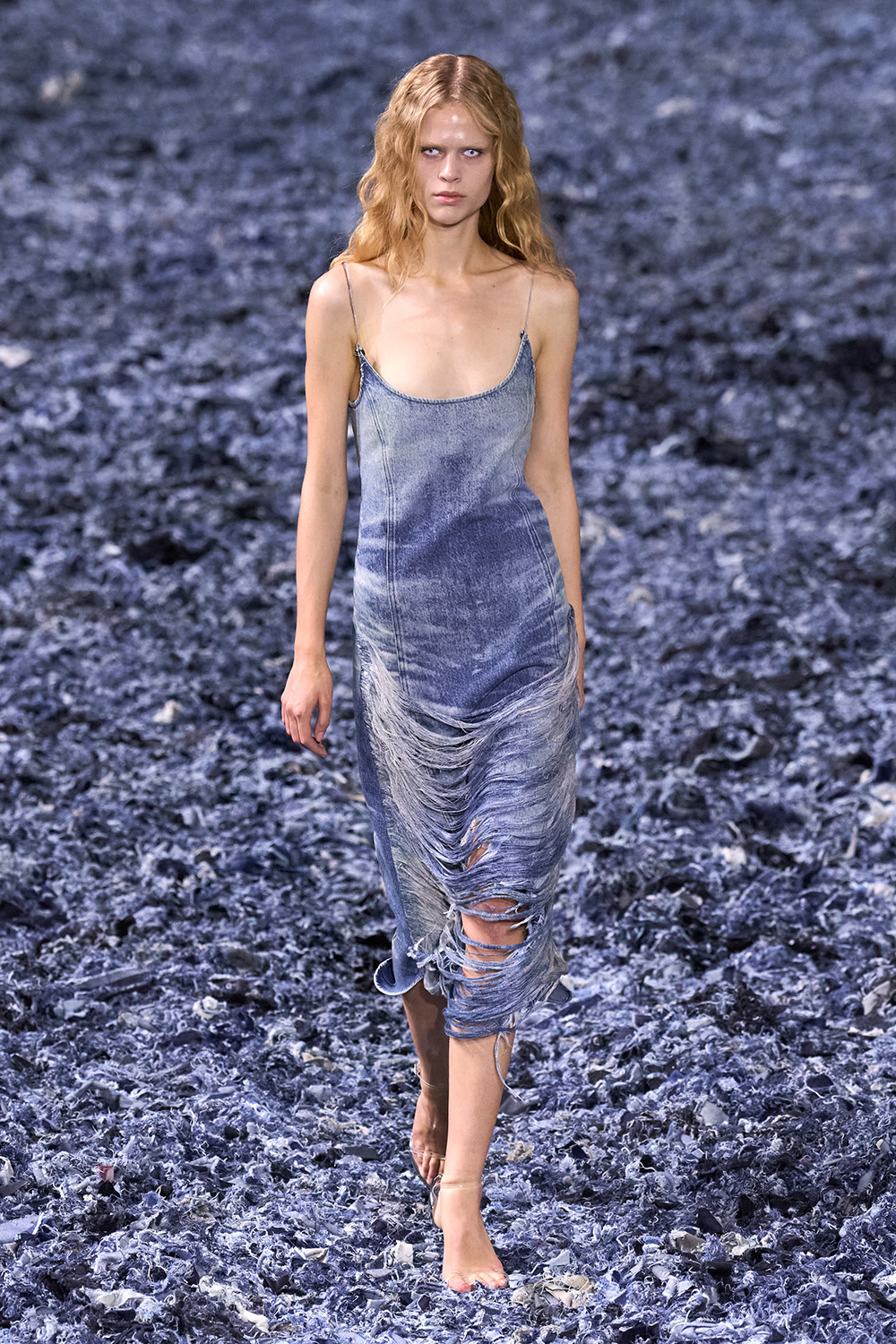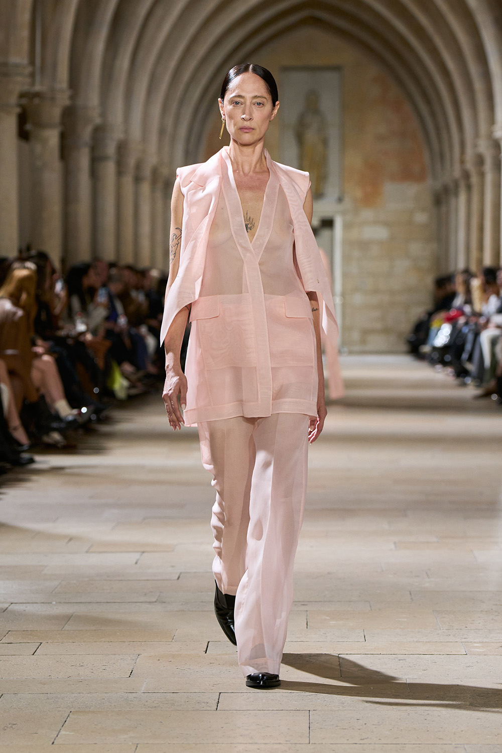 近年シアー素材はシーズンを問わず登場するが、この春夏は実に多種多様。オーガンジーやシフォン、ジョーゼットからチュール、メッシュ、フィッシュネットまでが見られた。ナイロンやハイゲージニットも透けるほど薄く軽やかだ。