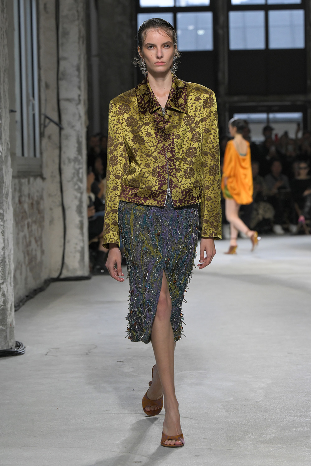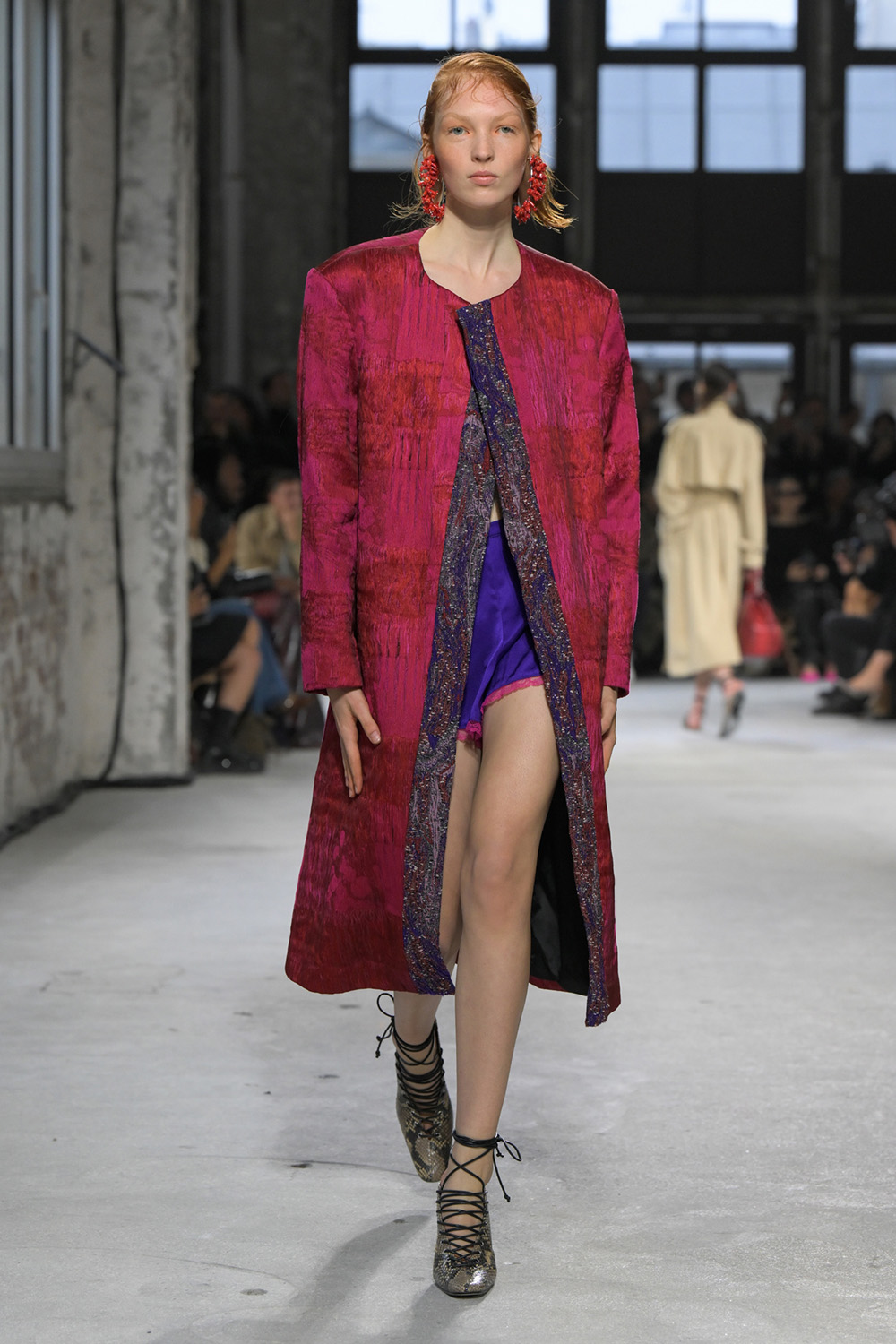 ルビーやアメジスト、エメラルドといった宝石のような色彩は、深みのある鮮やかさが魅力。光沢素材との相性がいい。好例は、ショー終盤にジュエルトーンを連打した「サンローラン(SAINT LAURENT)」や独特の色柄合わせを見せた「ドリス ヴァン ノッテン(DRIES VAN NOTEN)」。