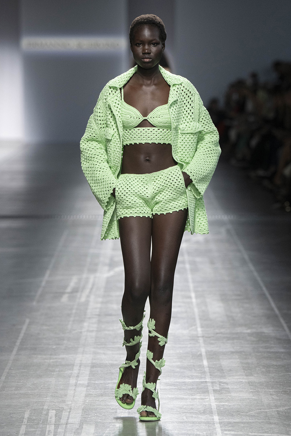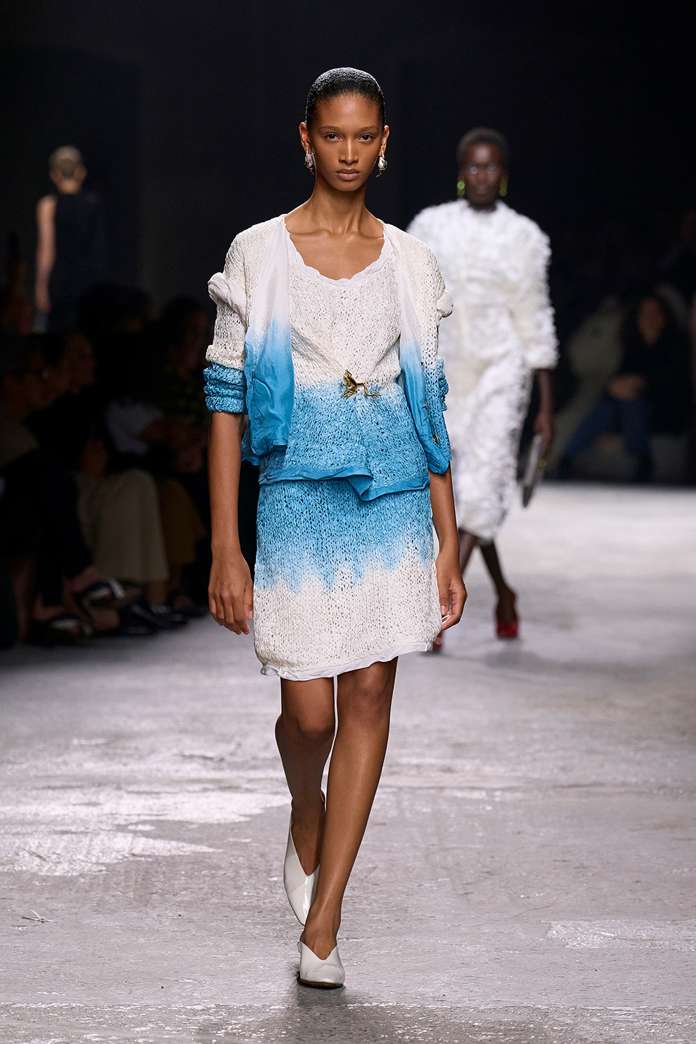 透かし編みやクロシェ編みなど、涼しげでクラフト感のあるハンドニットは開放的なムードに合致。平紐を編んだドライタッチのニットにグラデーション染めを施した「ボッテガ・ヴェネタ(BOTTEGA VENETA)」など、職人の技巧を感じる提案が印象的だ。