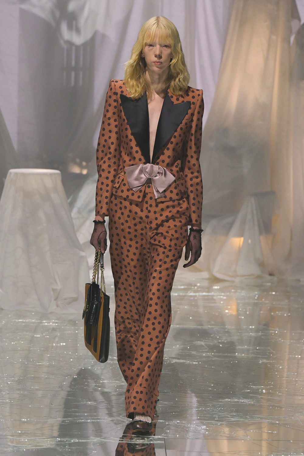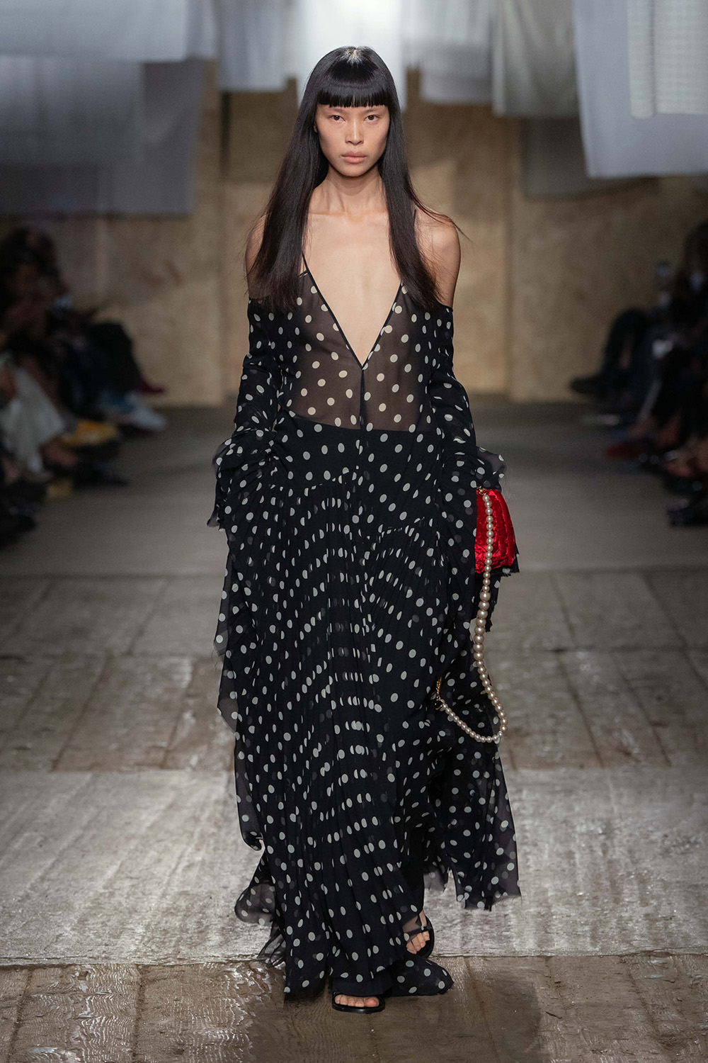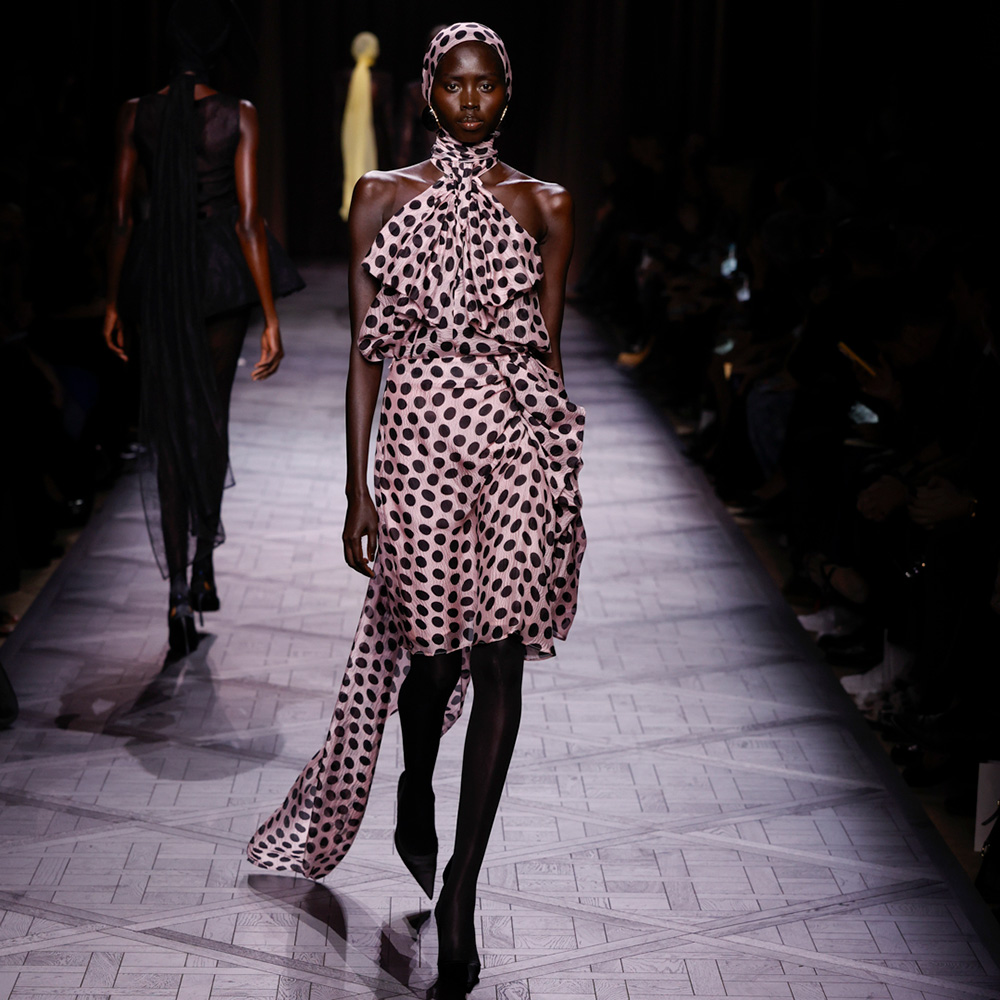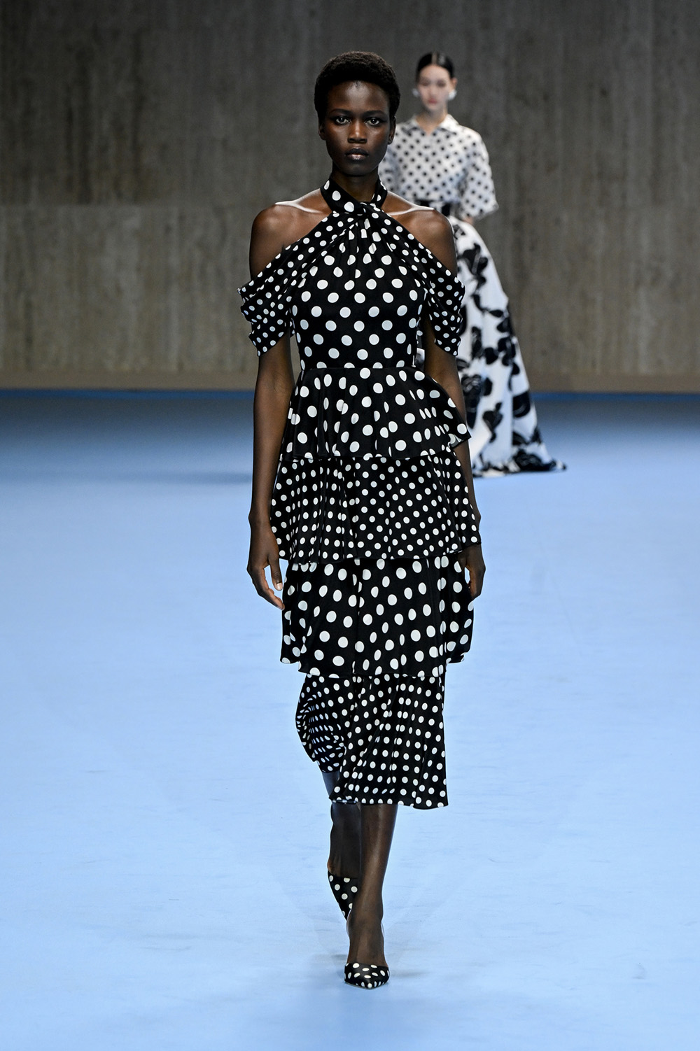 クラシックなフェミニニティーの表現として、ドットも見られた。代表的なのは、創業者を象徴する要素を取り入れた「ヴァレンティノ(VALENTINO)」。定番の黒×白だけでなく、さまざまな配色でテーラードジャケットからドレスやスカートまでを彩った。